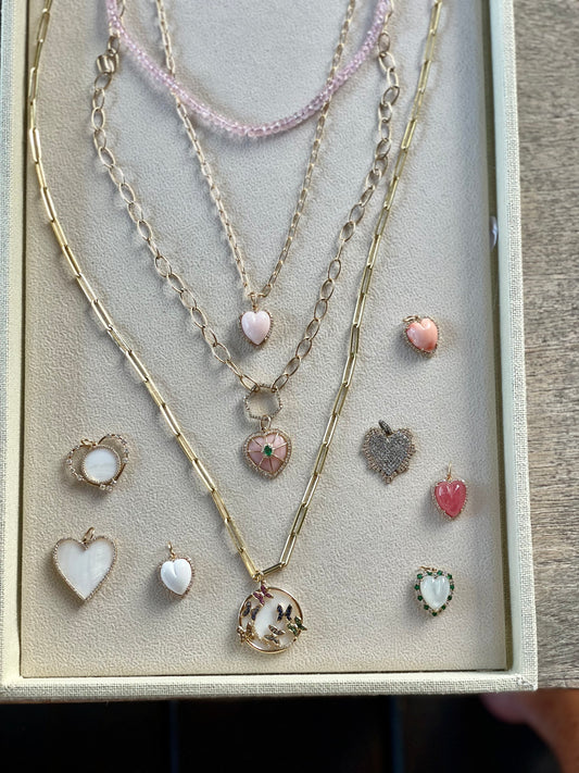 14K Gold Mother of Pearl Open Heart with set Diamond Boarder and Pave Diamonds