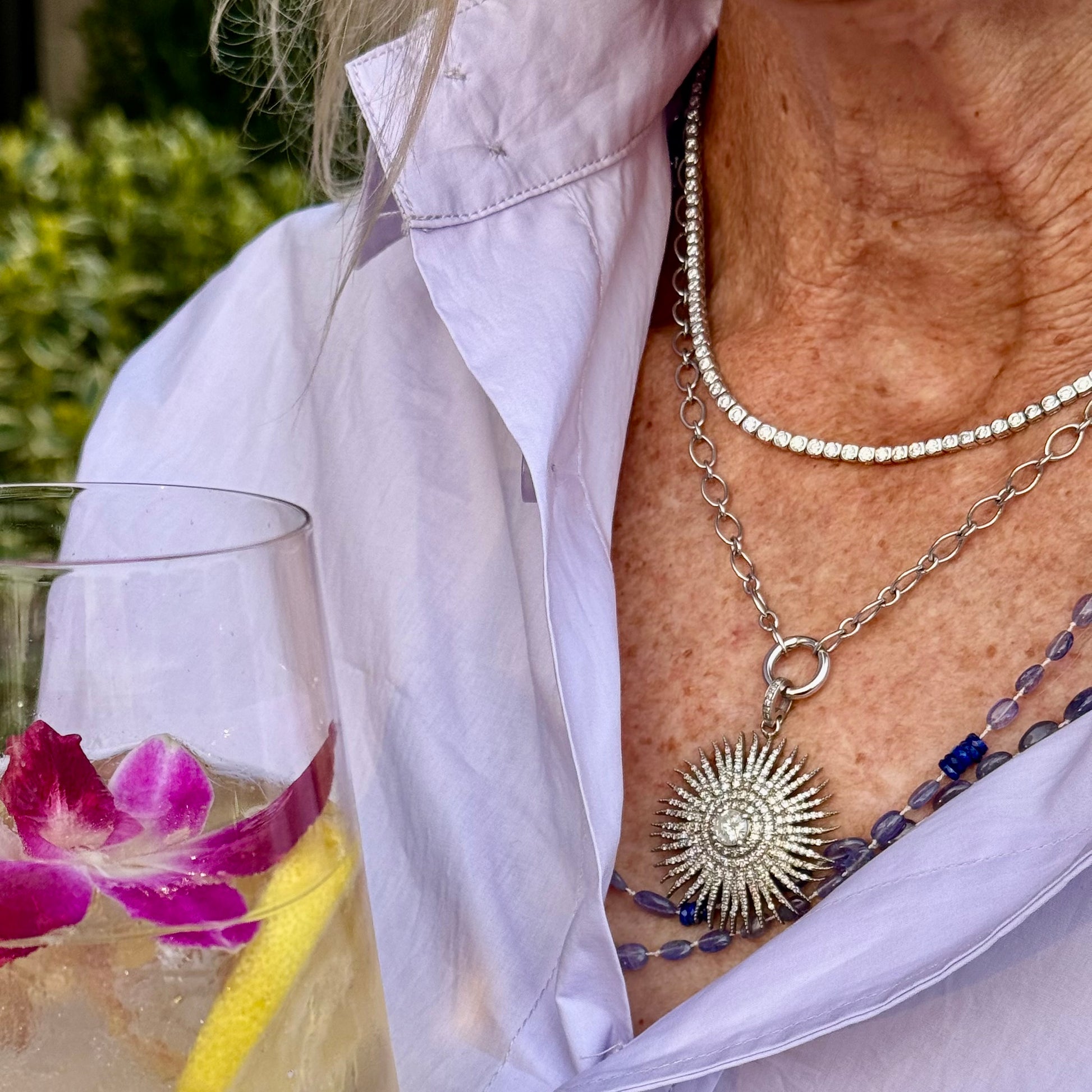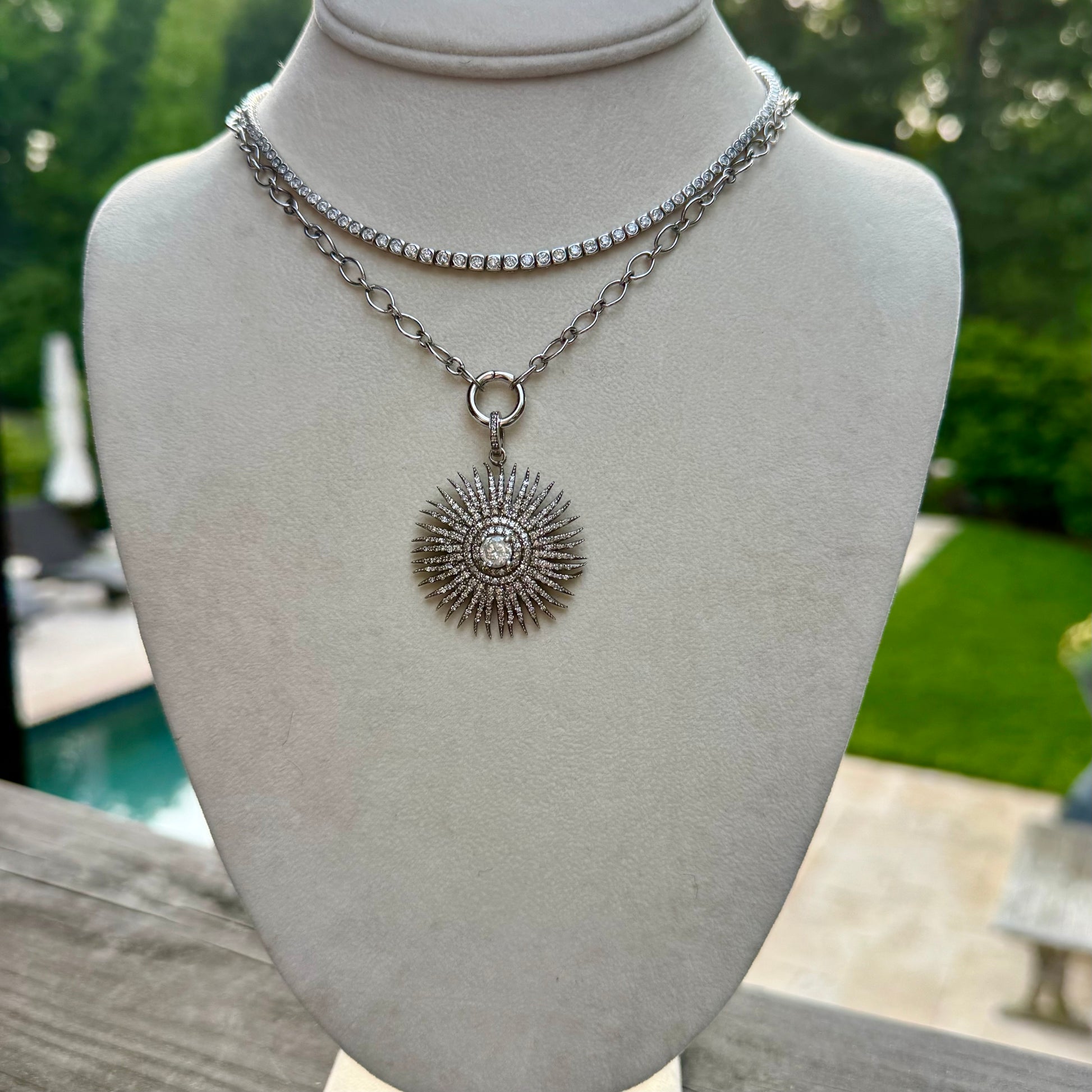 Stunning 14K white gold collar necklace. The diamonds are set in a square modern bezel. 8 inches of diamond bezels at the collar and beautiful square gold bezels the rest of the way around.  Gold 56.78 grams. Diamonds 7.17 carat. SI 1-2 diamonds.  FG color. Adjustable 15.5 inch to 18 inch. This necklace looks fabulous alone with the sparkle of the diamonds. Mix your gold necklaces in for a modern look.  Love the adjustable chain here to wear many different ways. Bezels are prized for holding diamonds in securely.