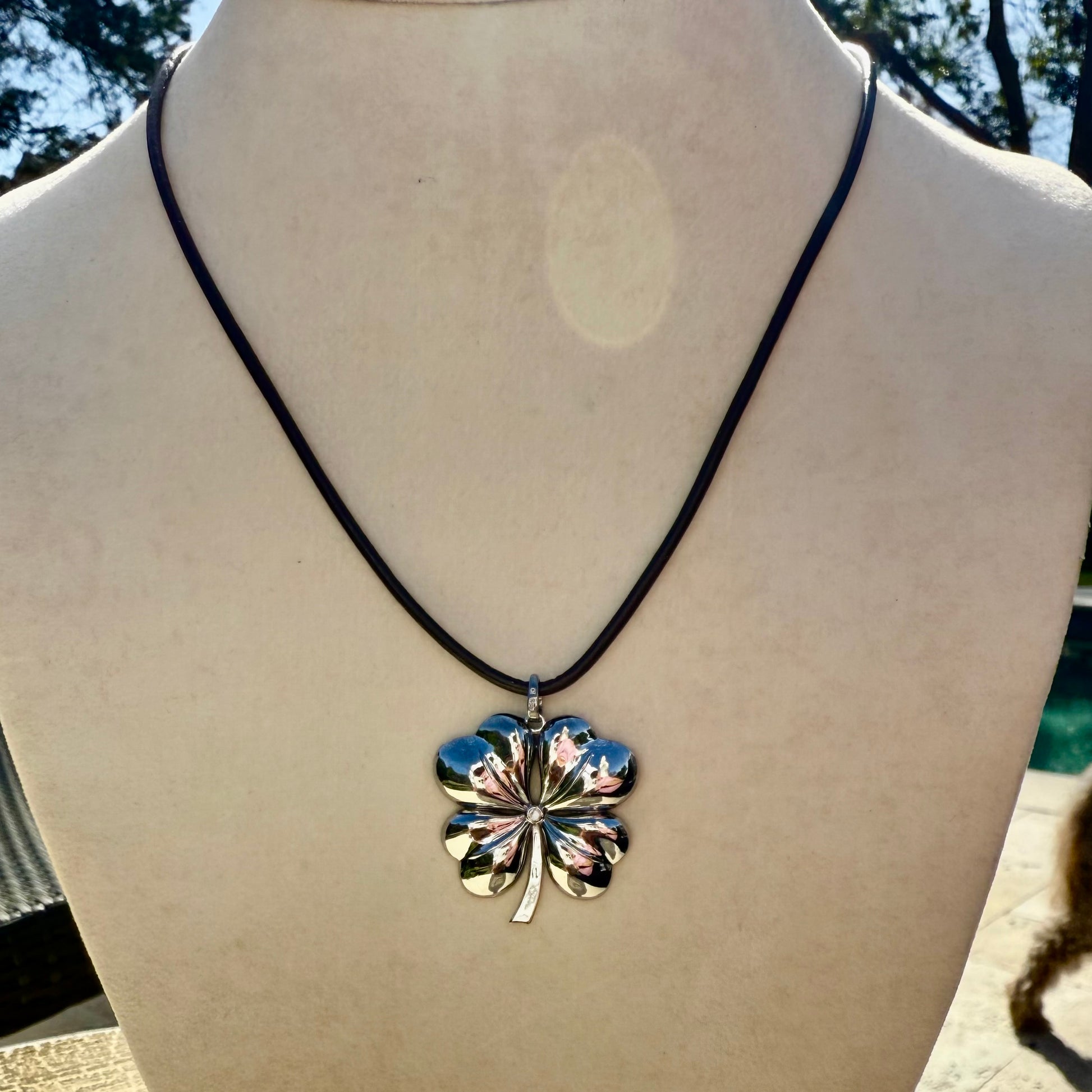 Beautiful clover with a center diamond. We have this on brown leather, but you can order in black or blue leather also. Add this to any chain for another look.