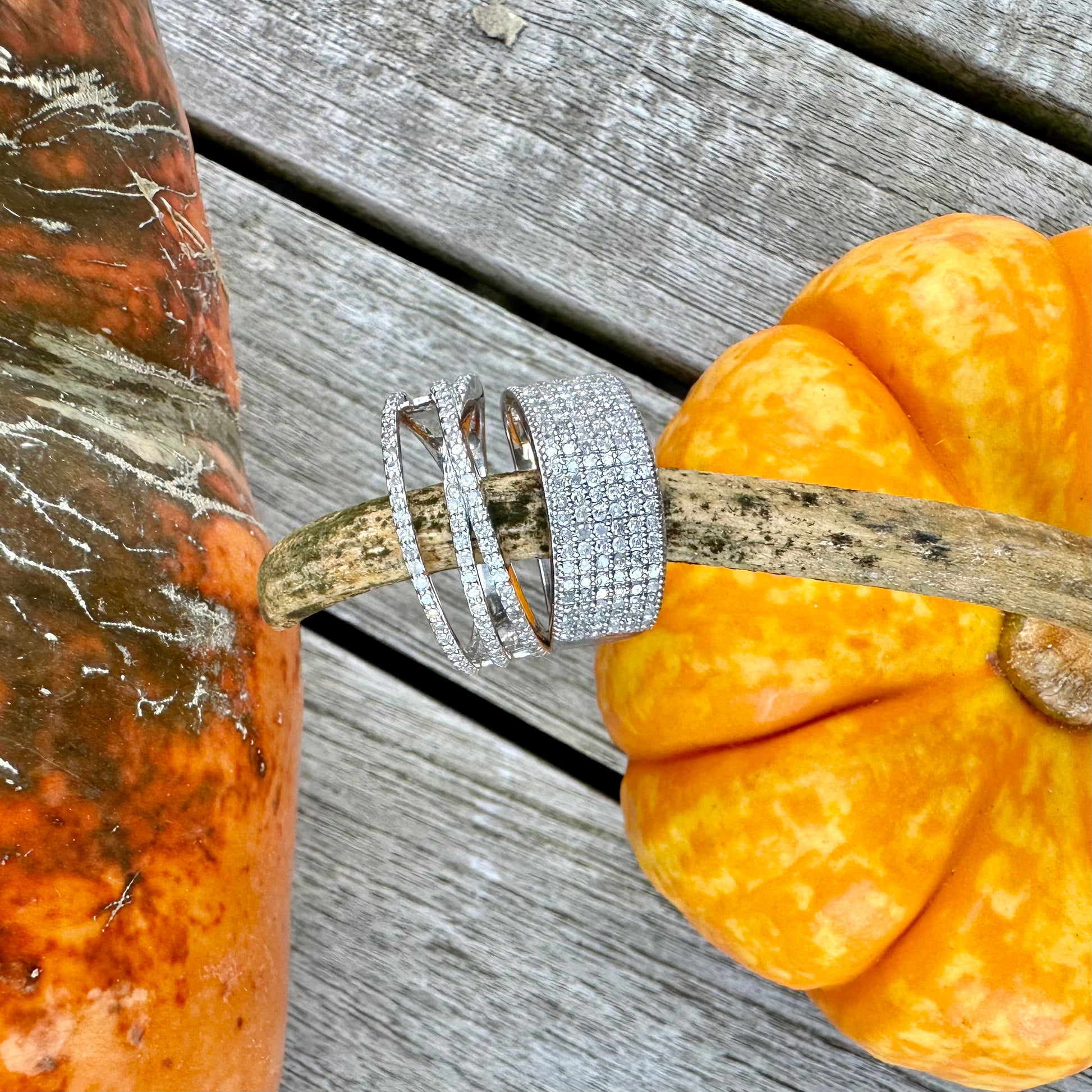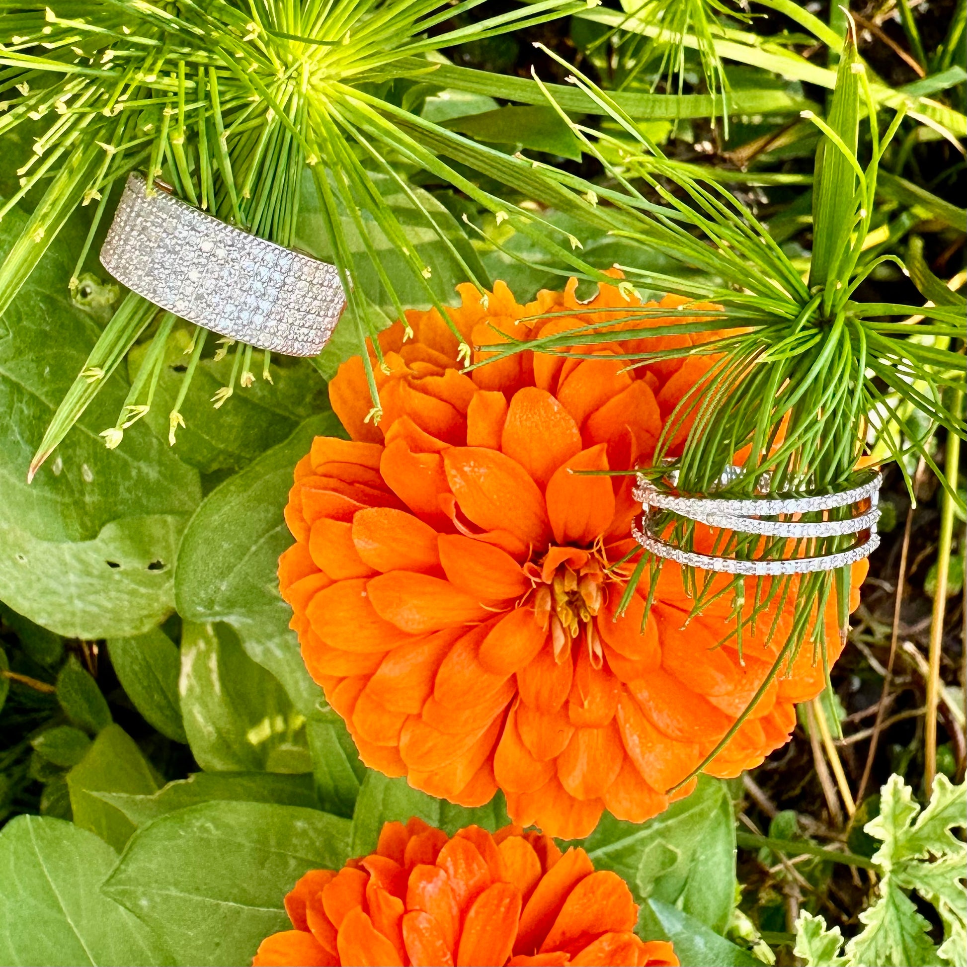 Cigar rings give your fingers a more elongated appearance. The brilliance brings this one to life. Diamonds and bright rhodium coated sterling. 9 mm wide.