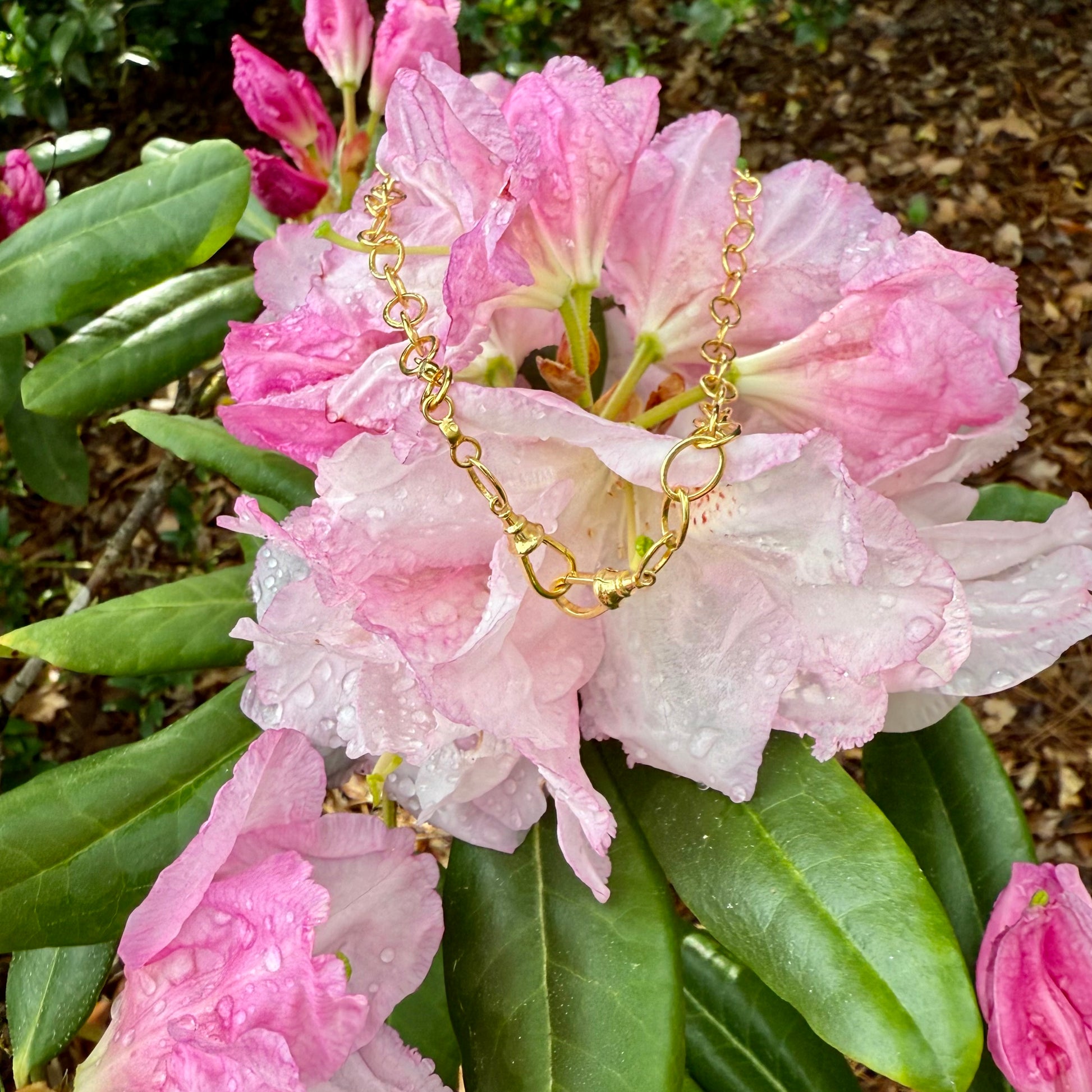 Rounded beautiful new oval gold chain in 14k gold and 10k gold. The 16 inch 14k gold chain has 2 sparkling diamonds in a bezel setting .10 carat. The double clasp can be clipped as a choker and have a pendant on the other clasp with the 2 diamonds. The choker length 10k necklace has 1 clasp. The 18 inch 10k necklace pairs well with our different clasps and connectors.  Shown here with our 14k gold diamond carabiner.