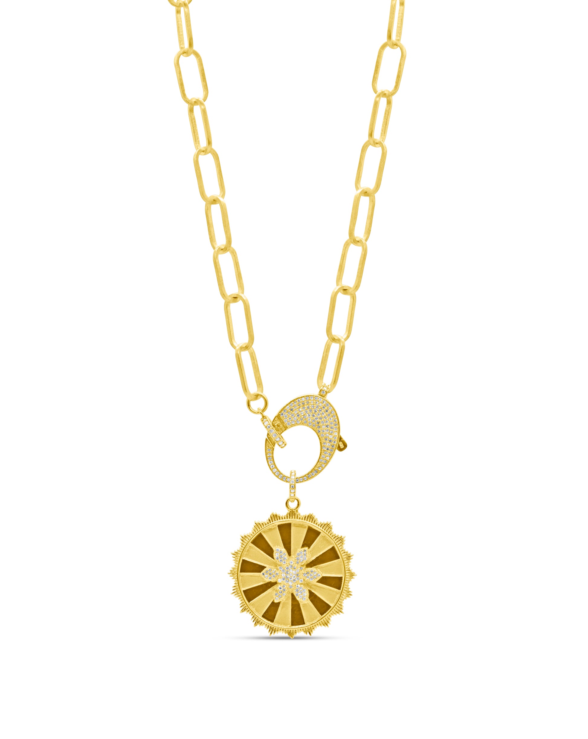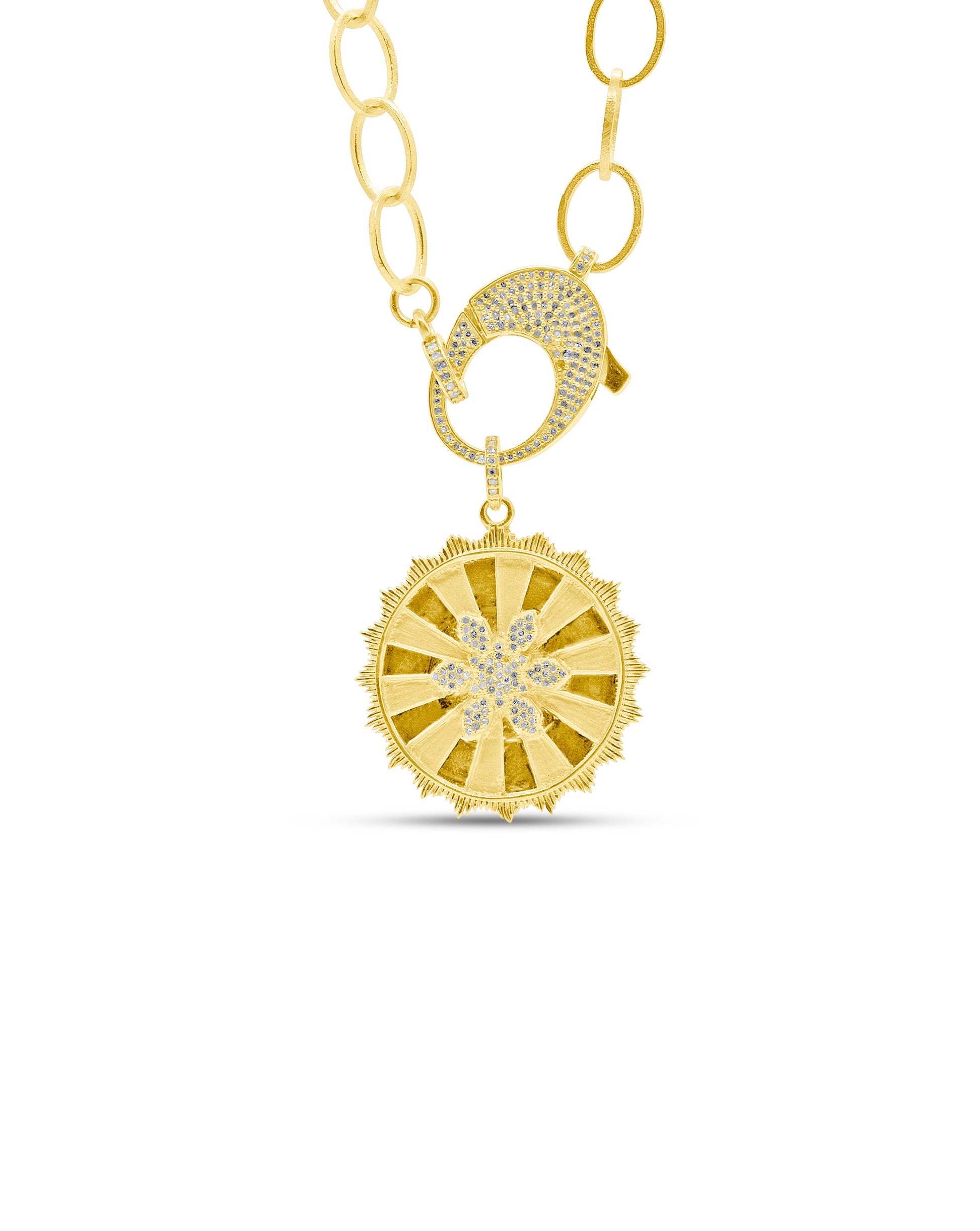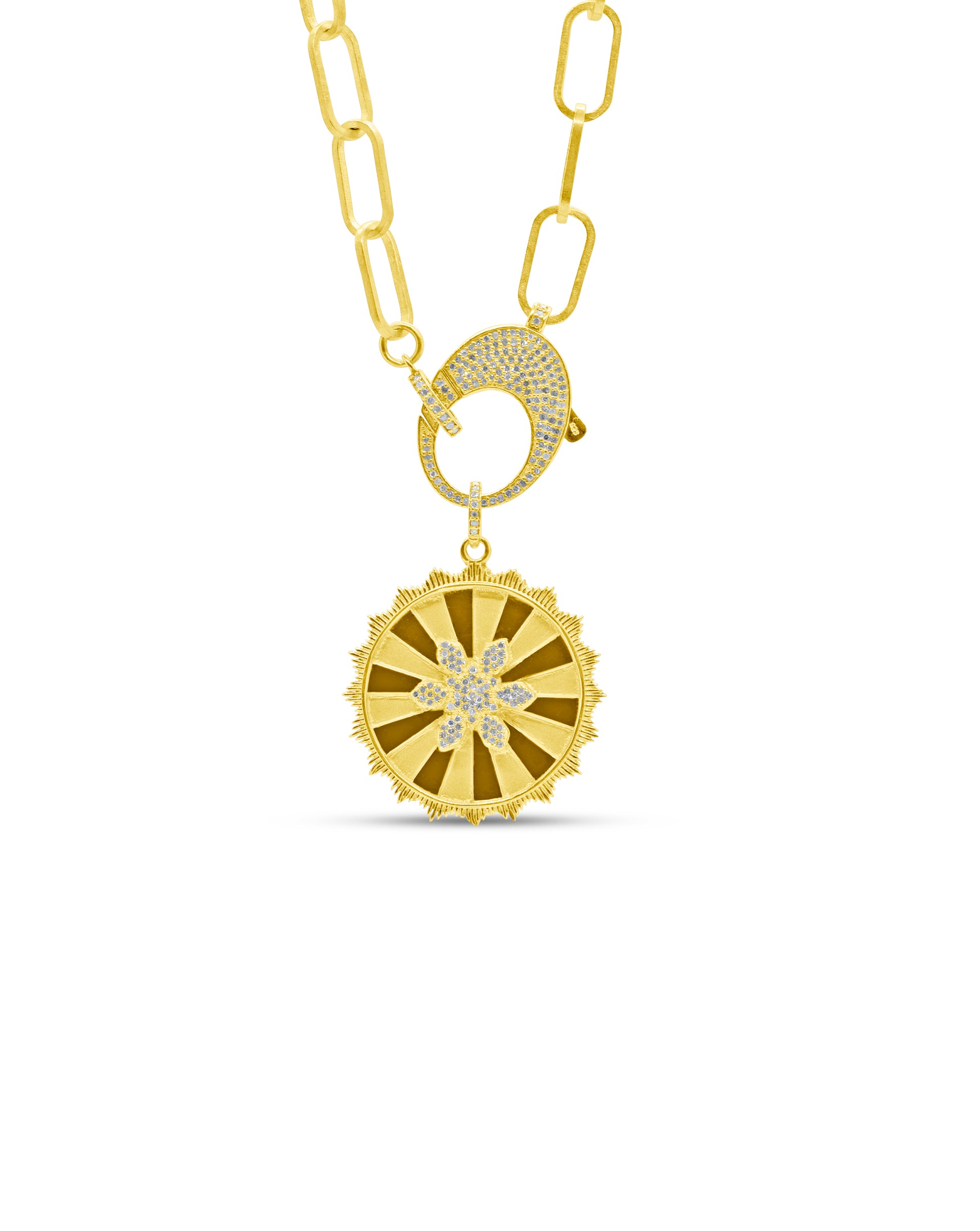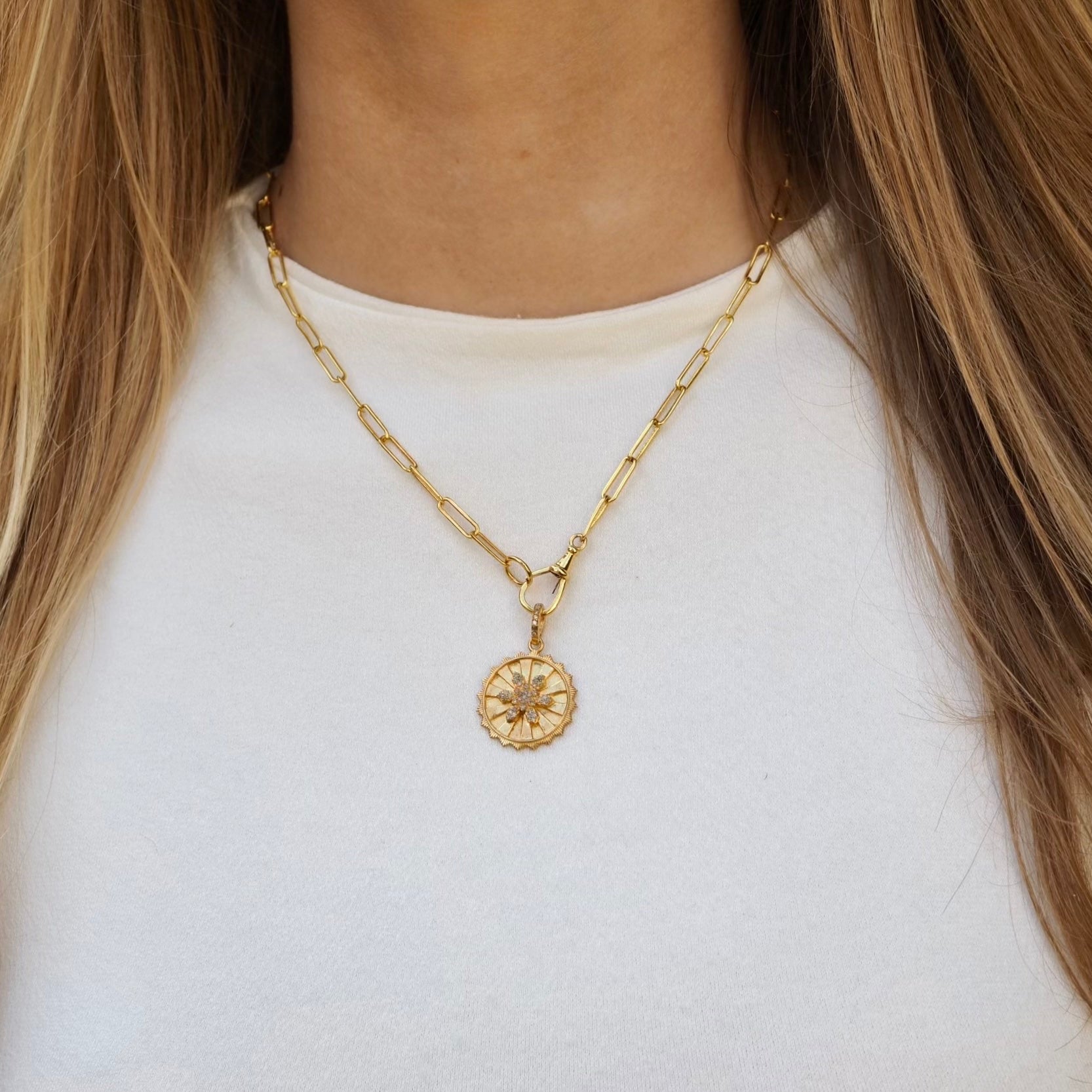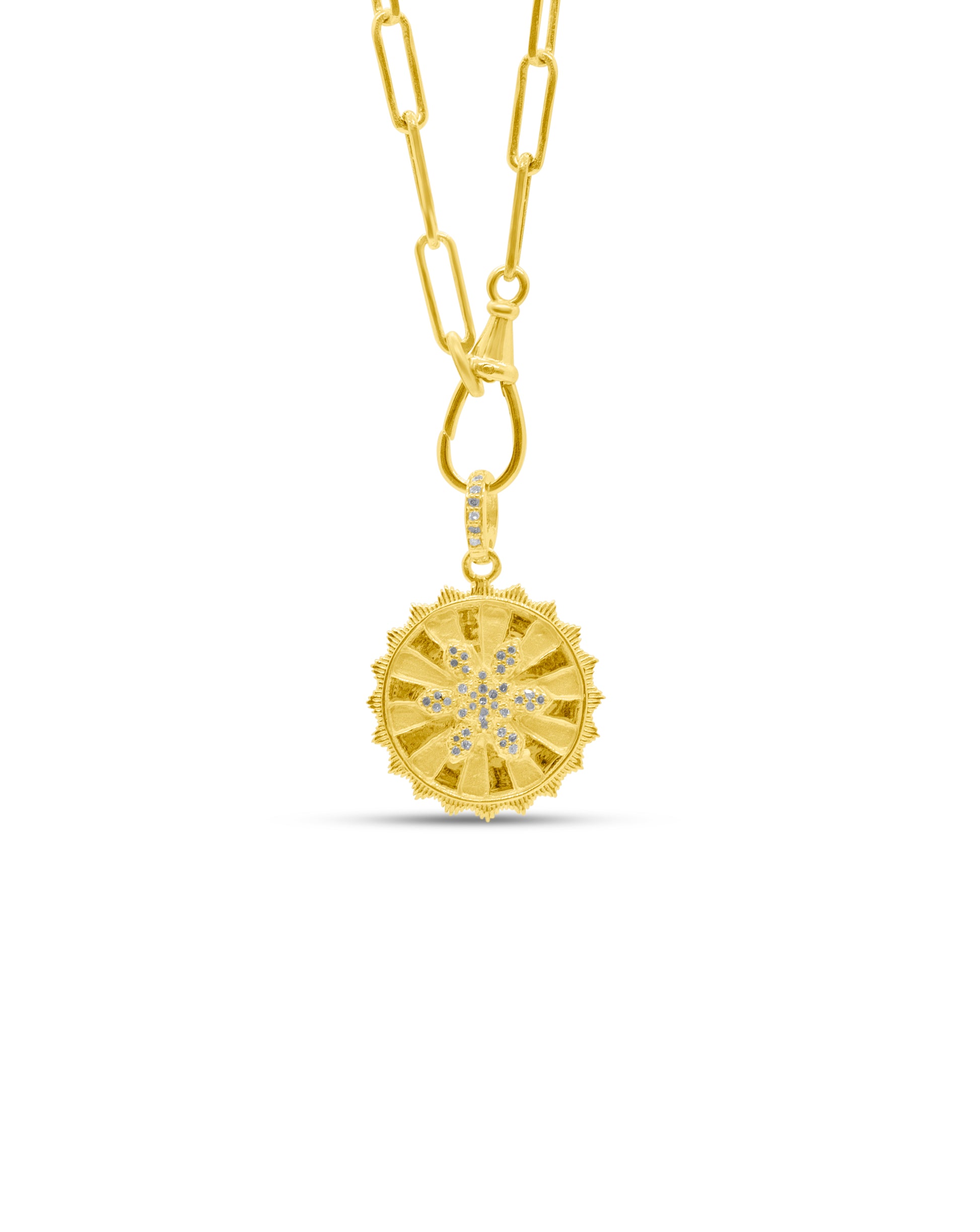 This sumptuous diamond pendant is inspired by the intricate stone windows at the Alahambra Palace in Granada. The substantial weight gives it a luxurious feel. The surrounding bright and matte gold accentuate the inner diamonds. This will become your go-to piece for your most stylish outfits. Shown here with our Essential Chain and with our Solid Gold Bead Chain.