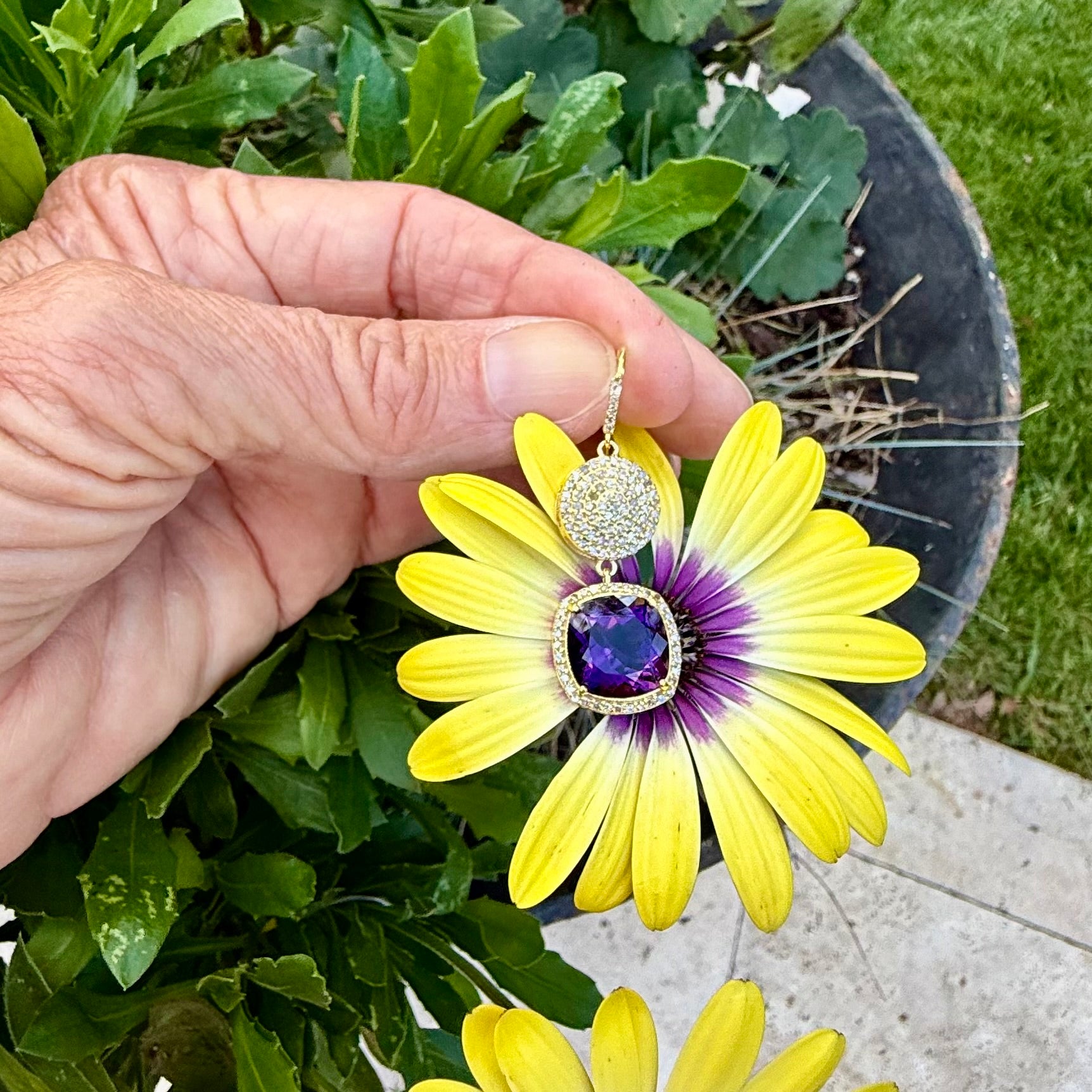 Stunning gemstone earring drops with diamonds in dreamy lemon quartz and deep amethyst. These dangles are just over 1/2 inch. The faceted cut on these gemstones makes them radiate with color.