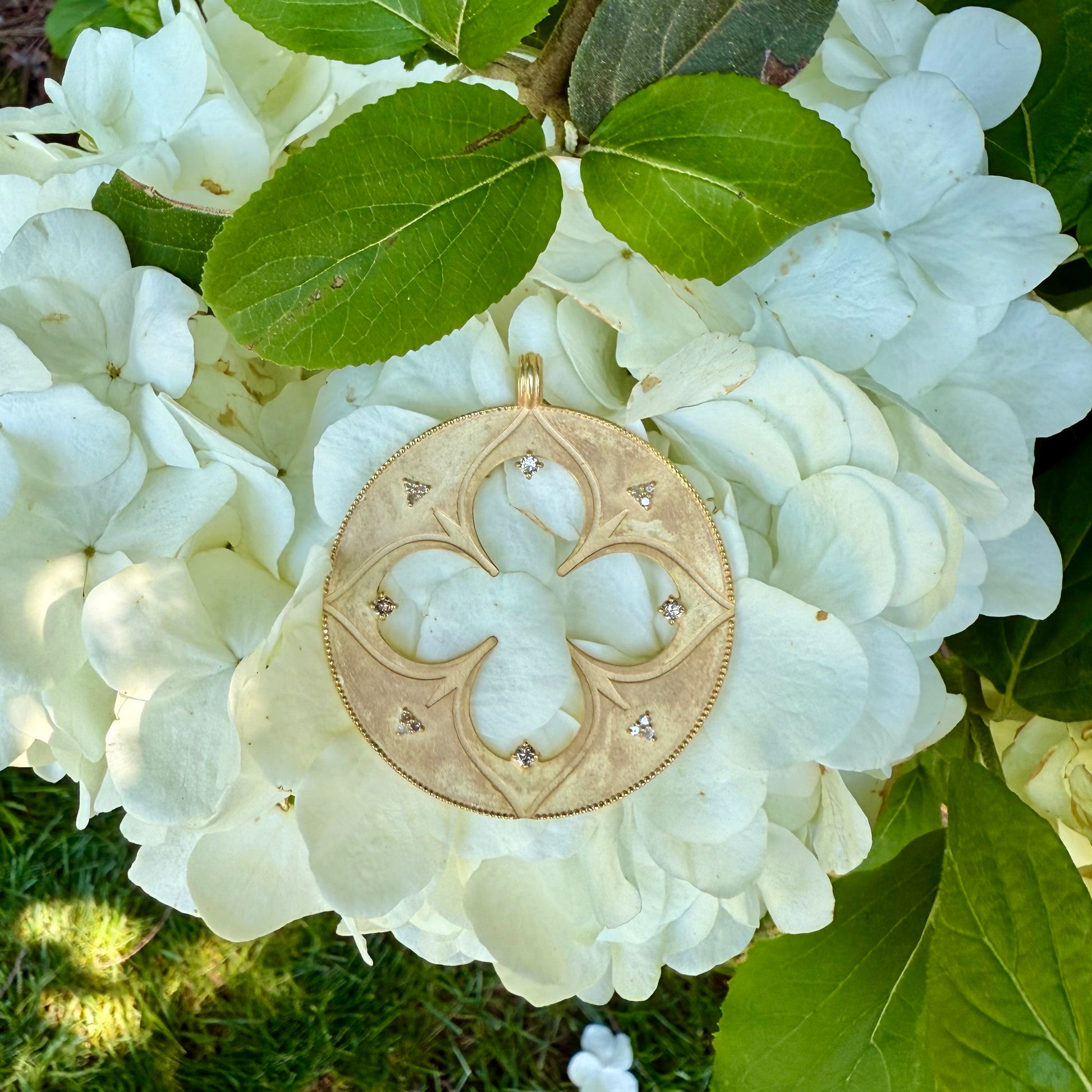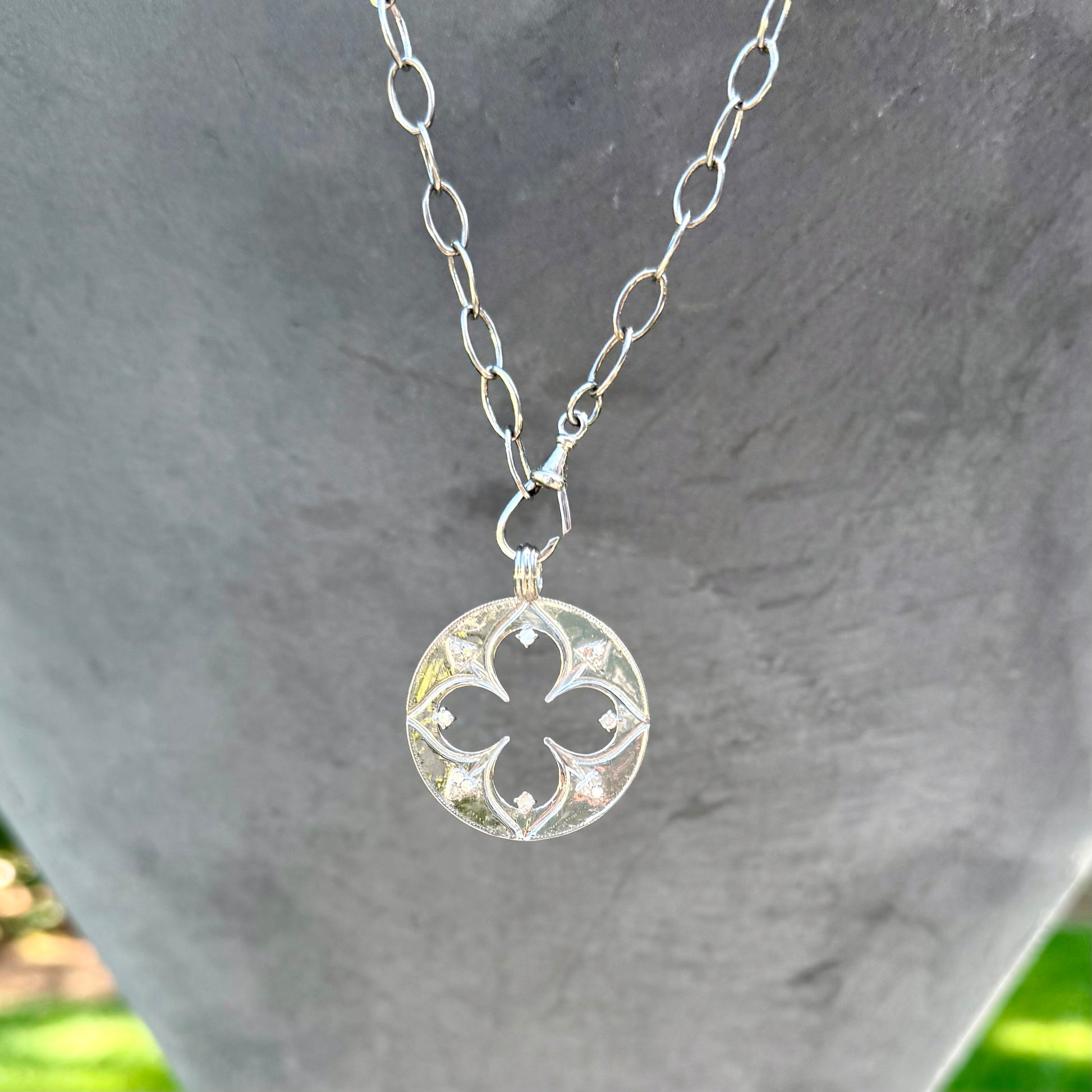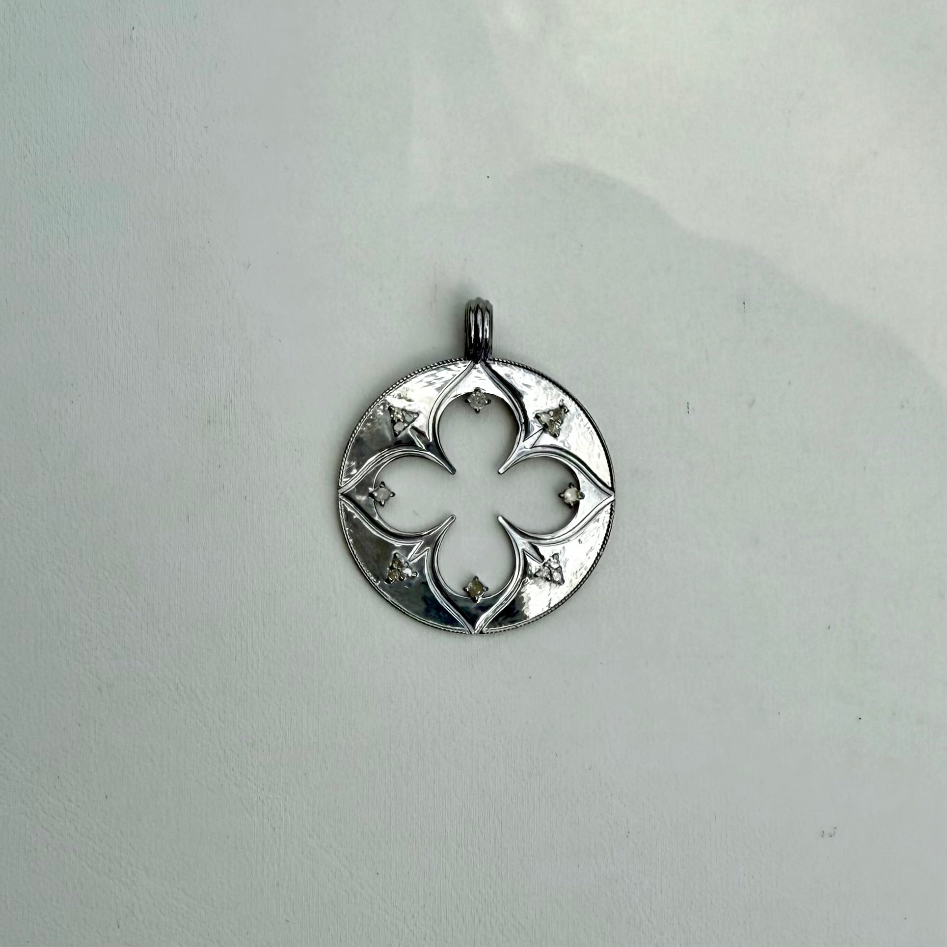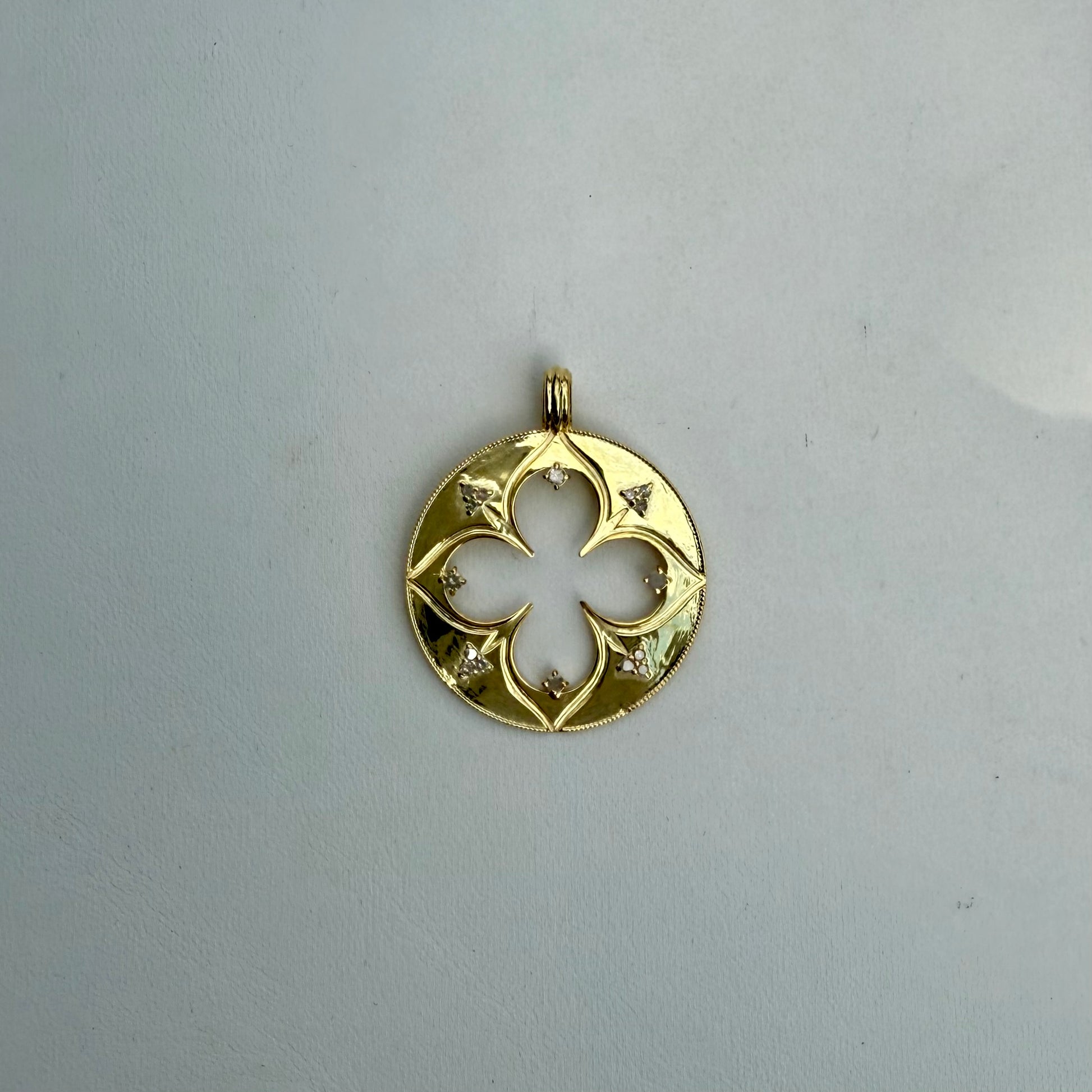 This silhouette quatrefoil, from the center of an arched entry portal, is enhanced with inlaid and point diamonds.