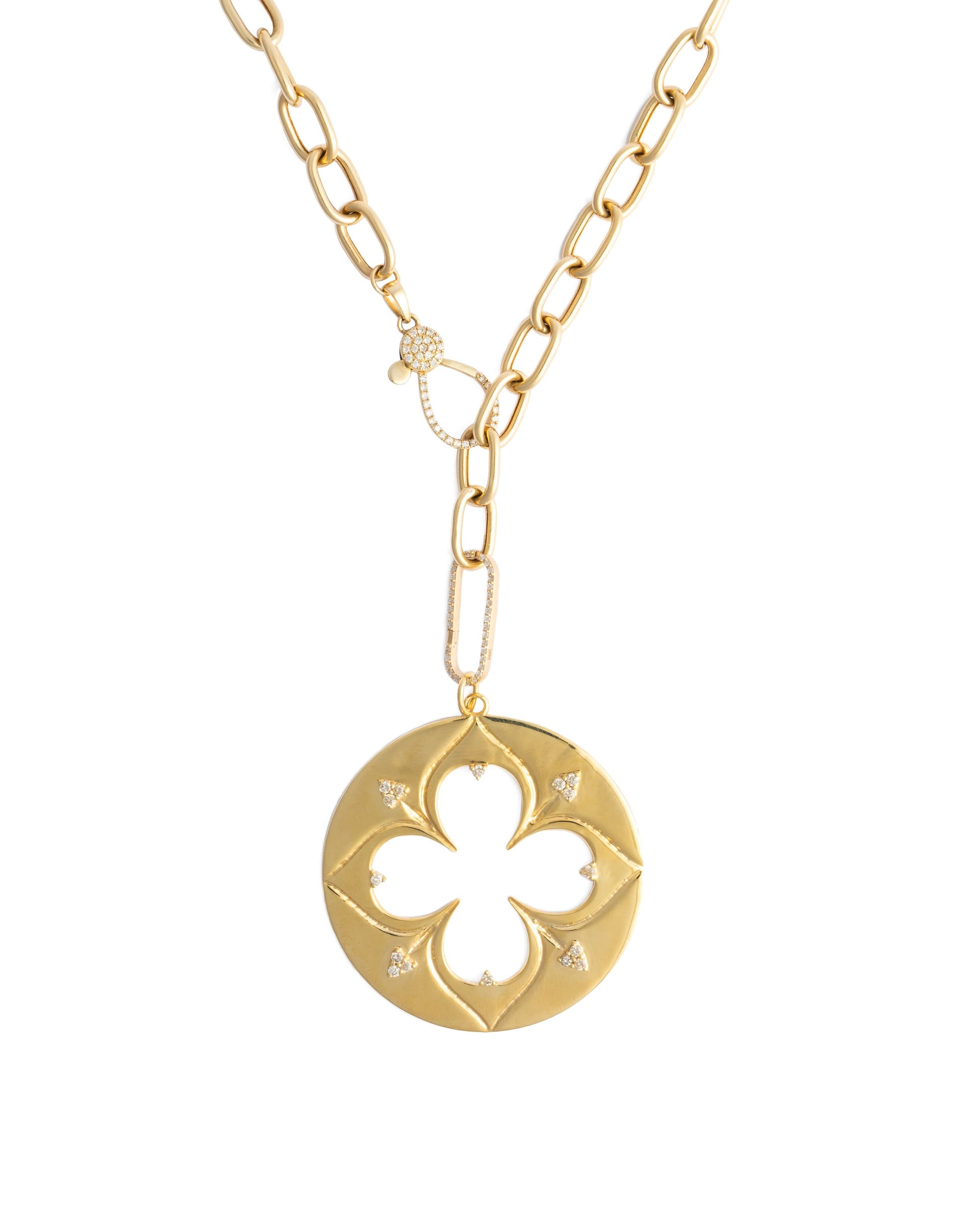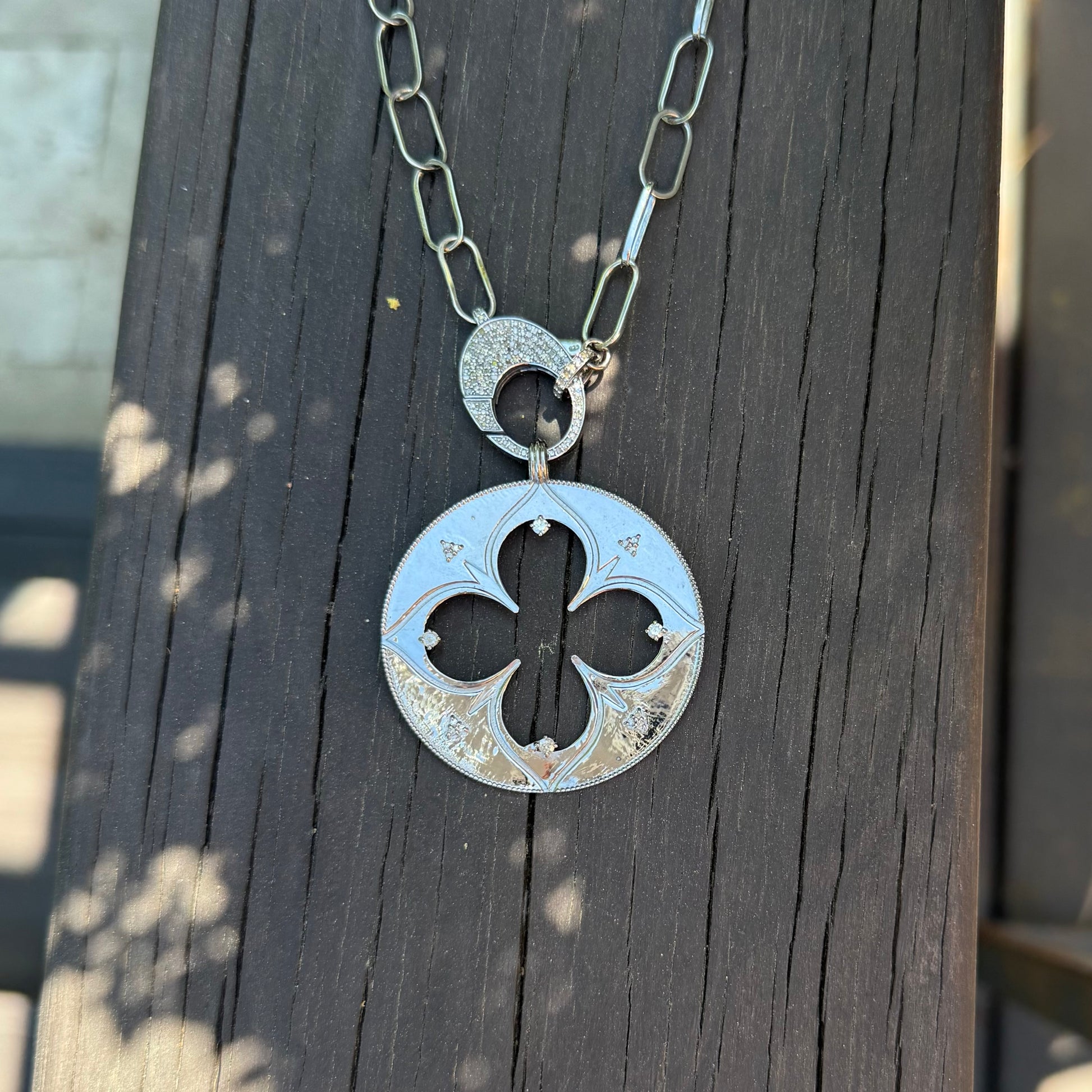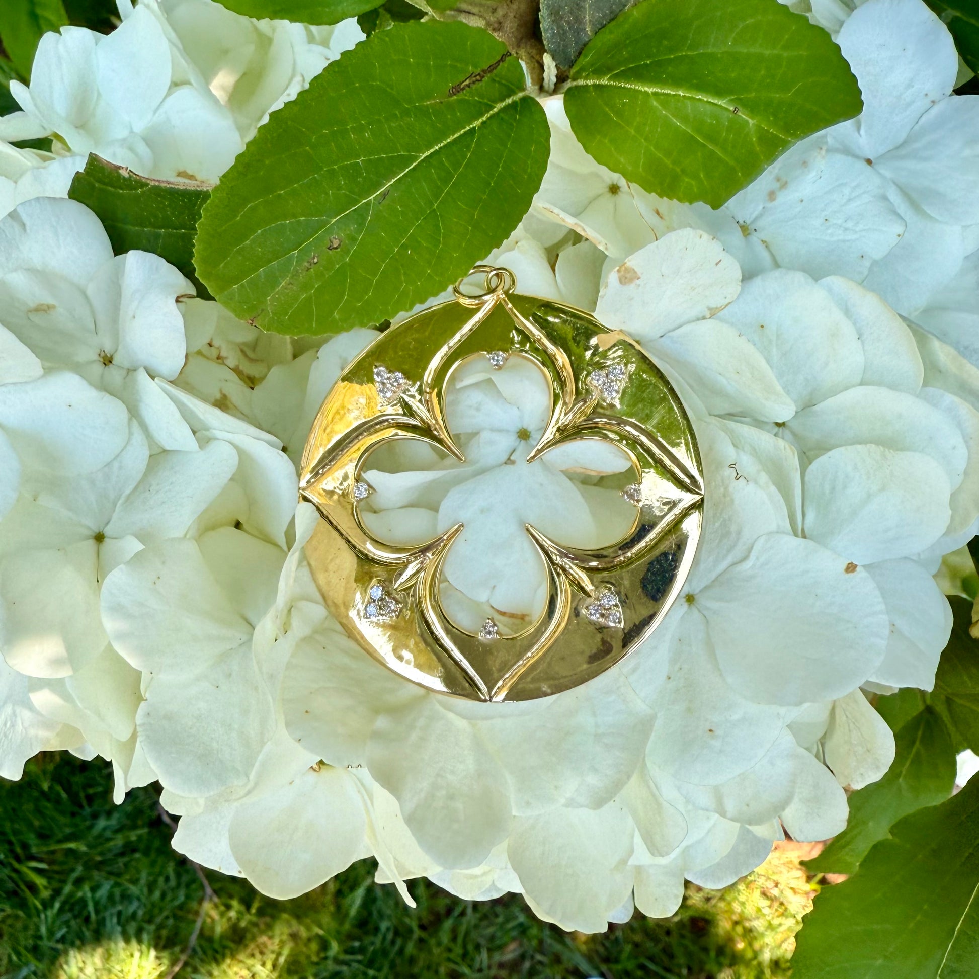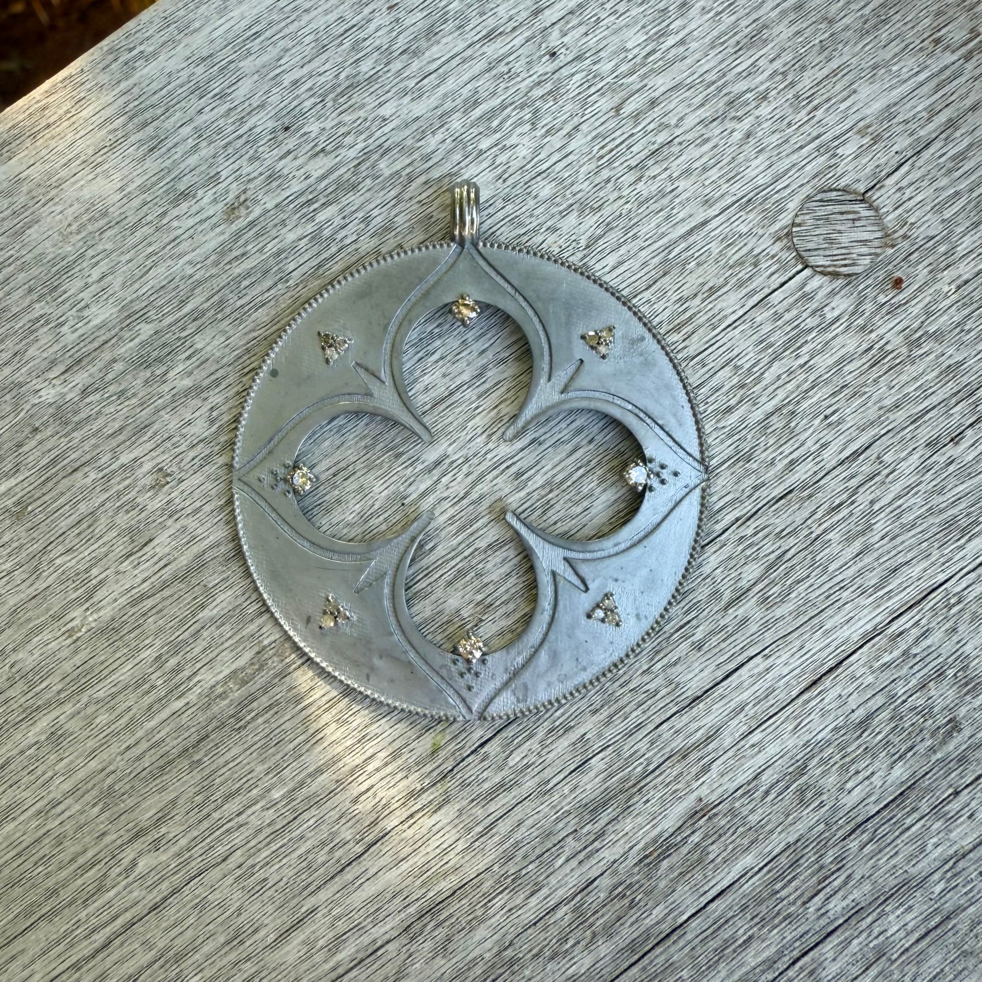 This silhouette quatrefoil, from the center of an arched entry portal, is enhanced with inlaid and point diamonds.