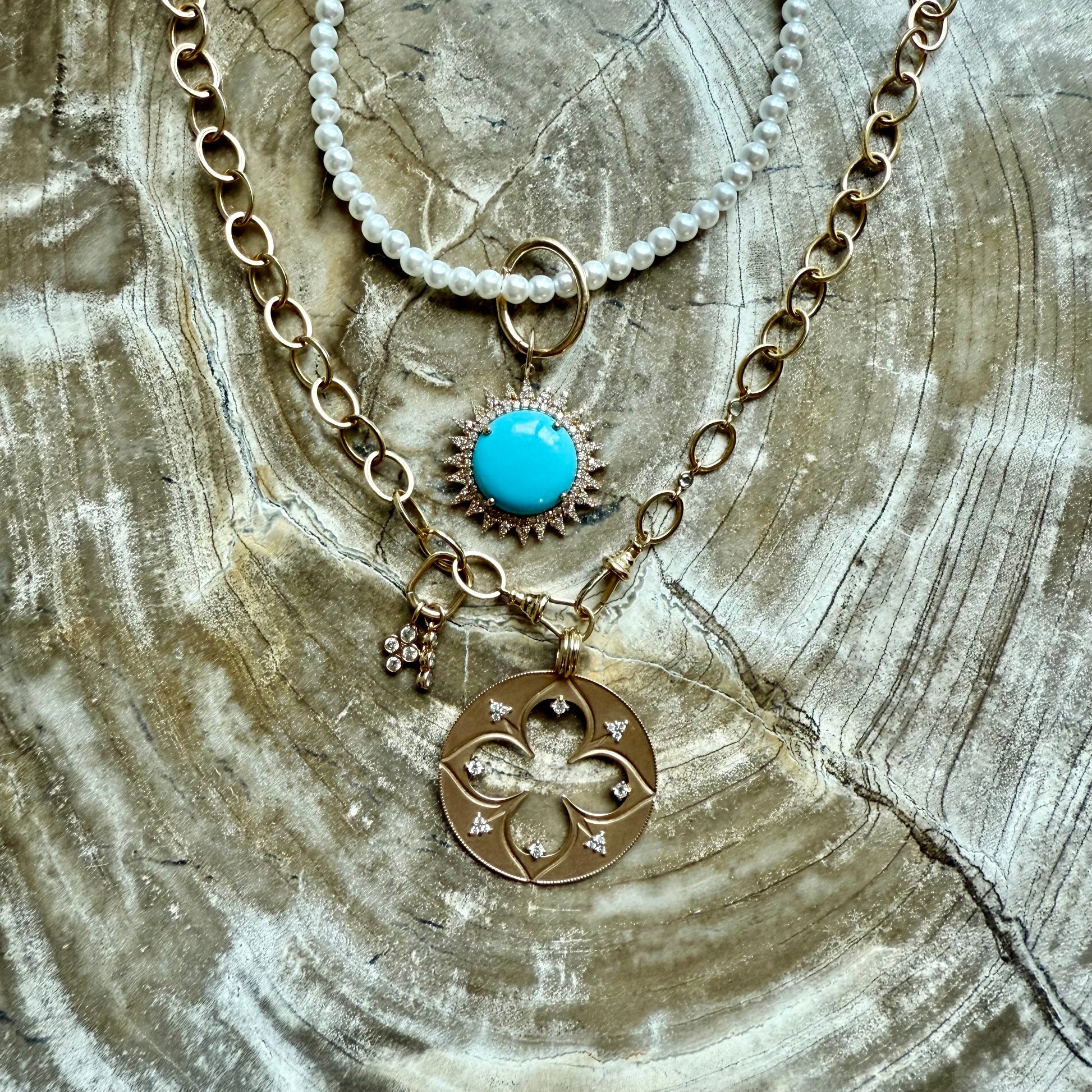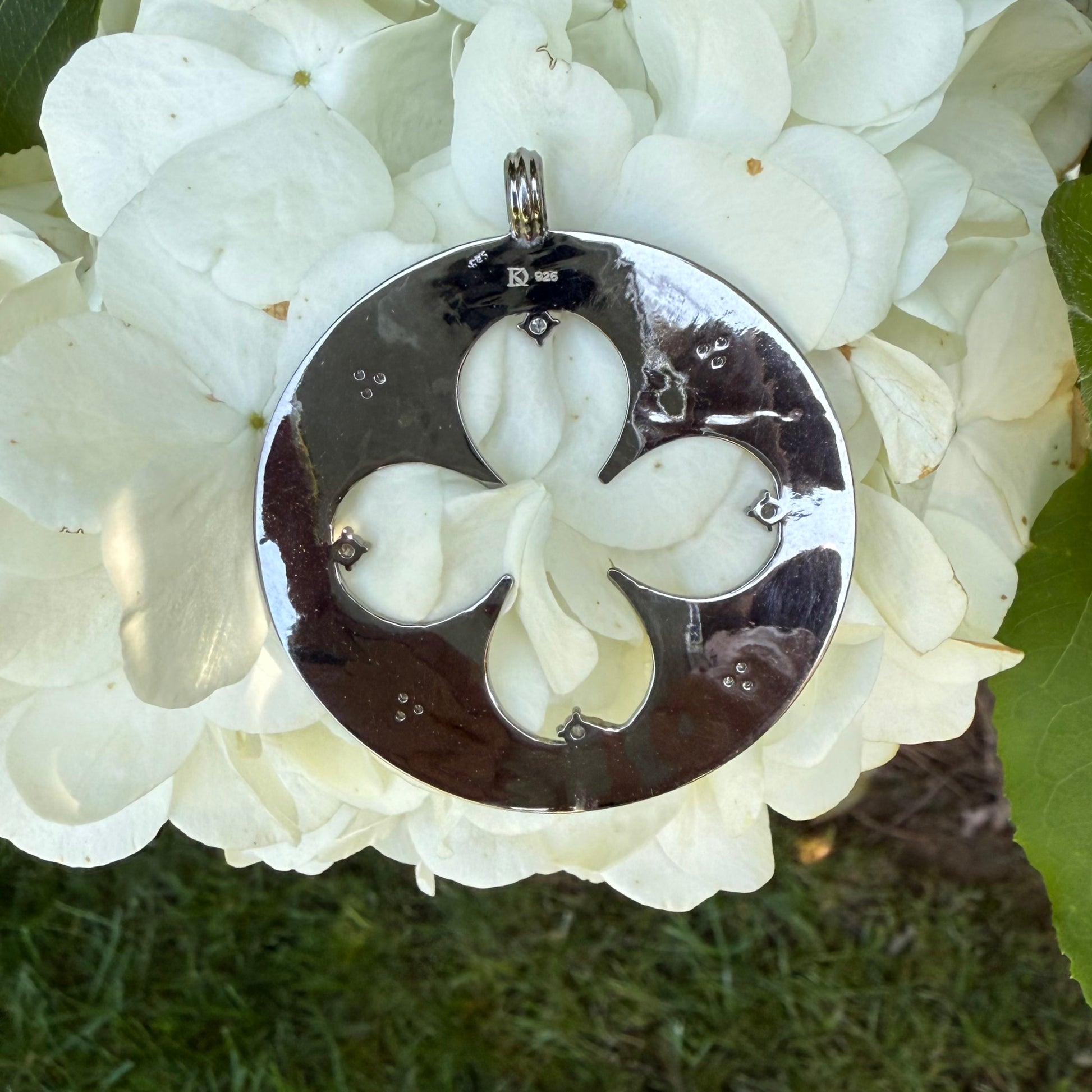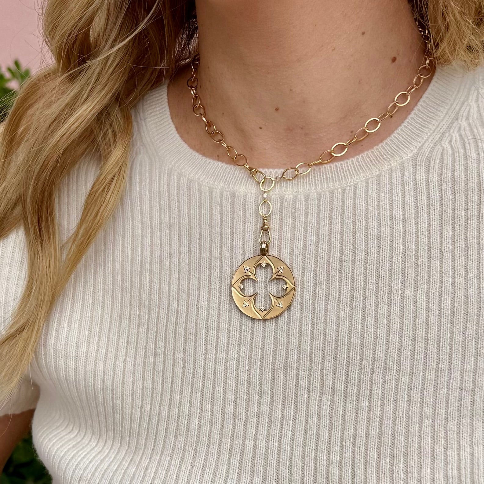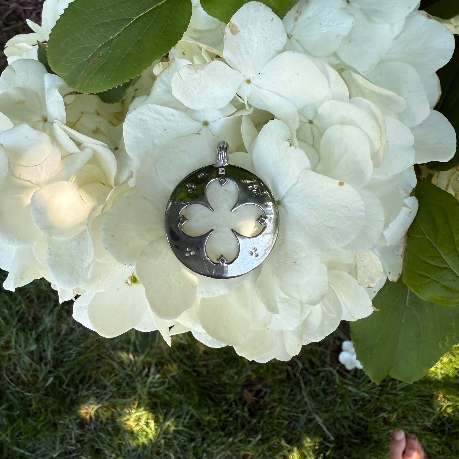 This silhouette quatrefoil, from the center of an arched entry portal, is enhanced with inlaid and point diamonds.