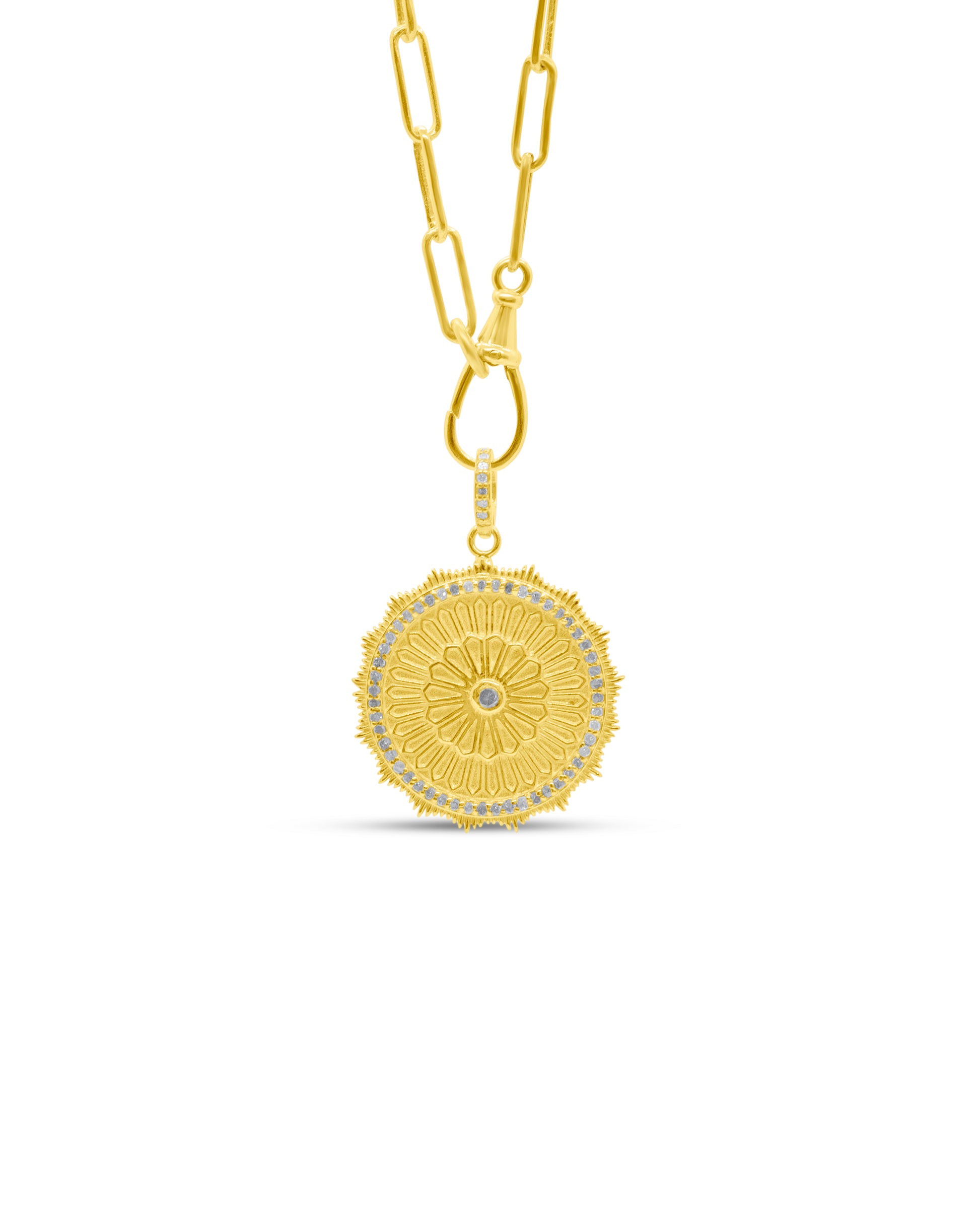 Memories of the City of Light and Notre-Dame Cathedral come to life in this bespoke pendant. Diamonds grace the center, outer ring and bail. Approximately 28 mm. Shown here with our Everyday Vermeil Paperclip Chain.