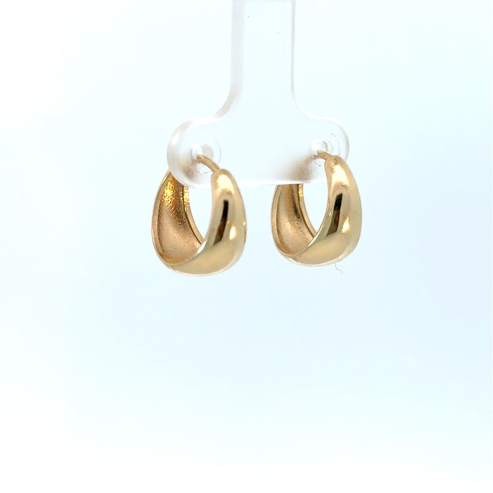 Beautiful shaped wide “V” huggie hoops. Super lightweight clip back. Perfect for everyday wear. 15mm. 2.600 ct 14k gold.