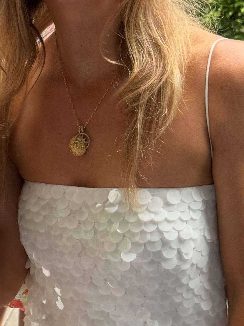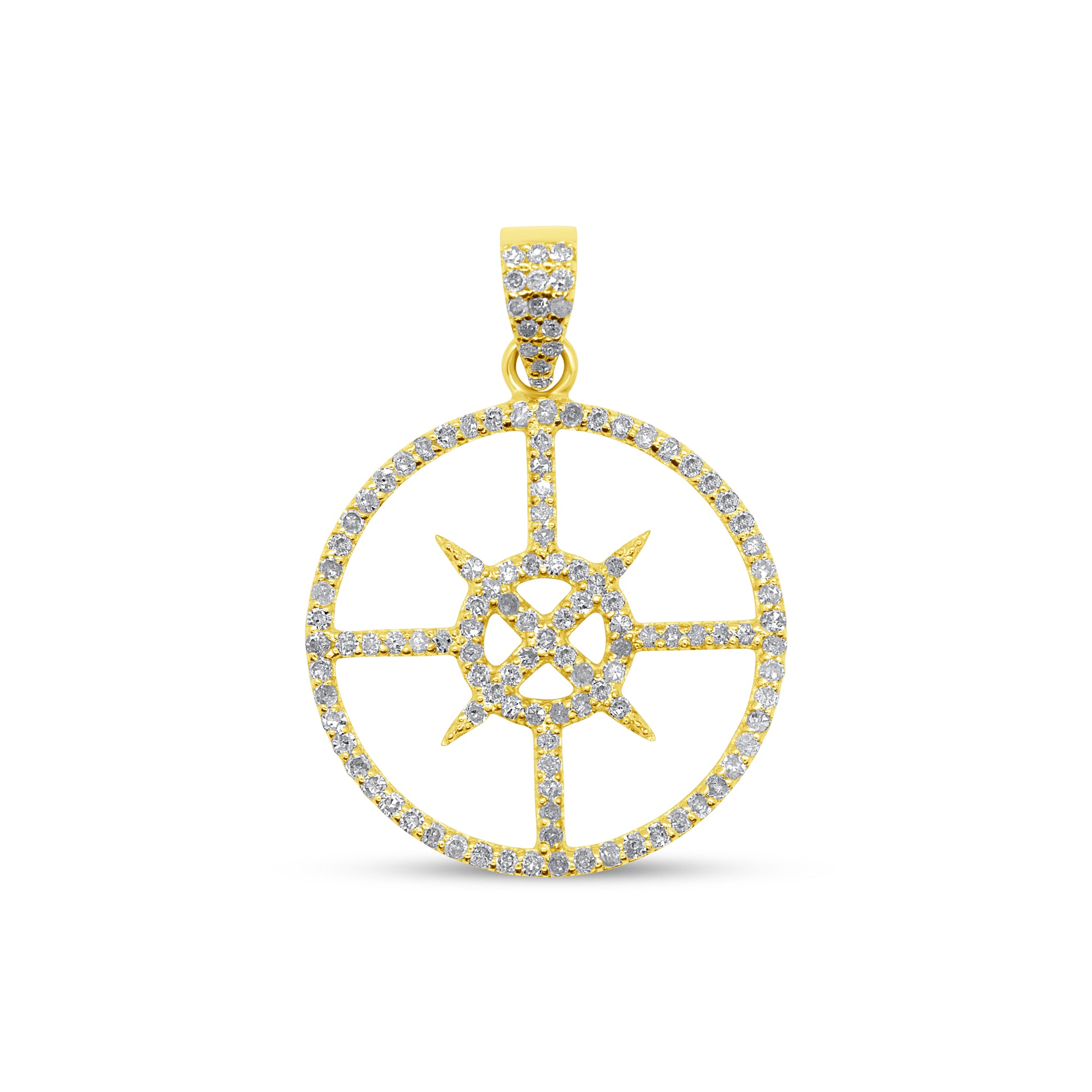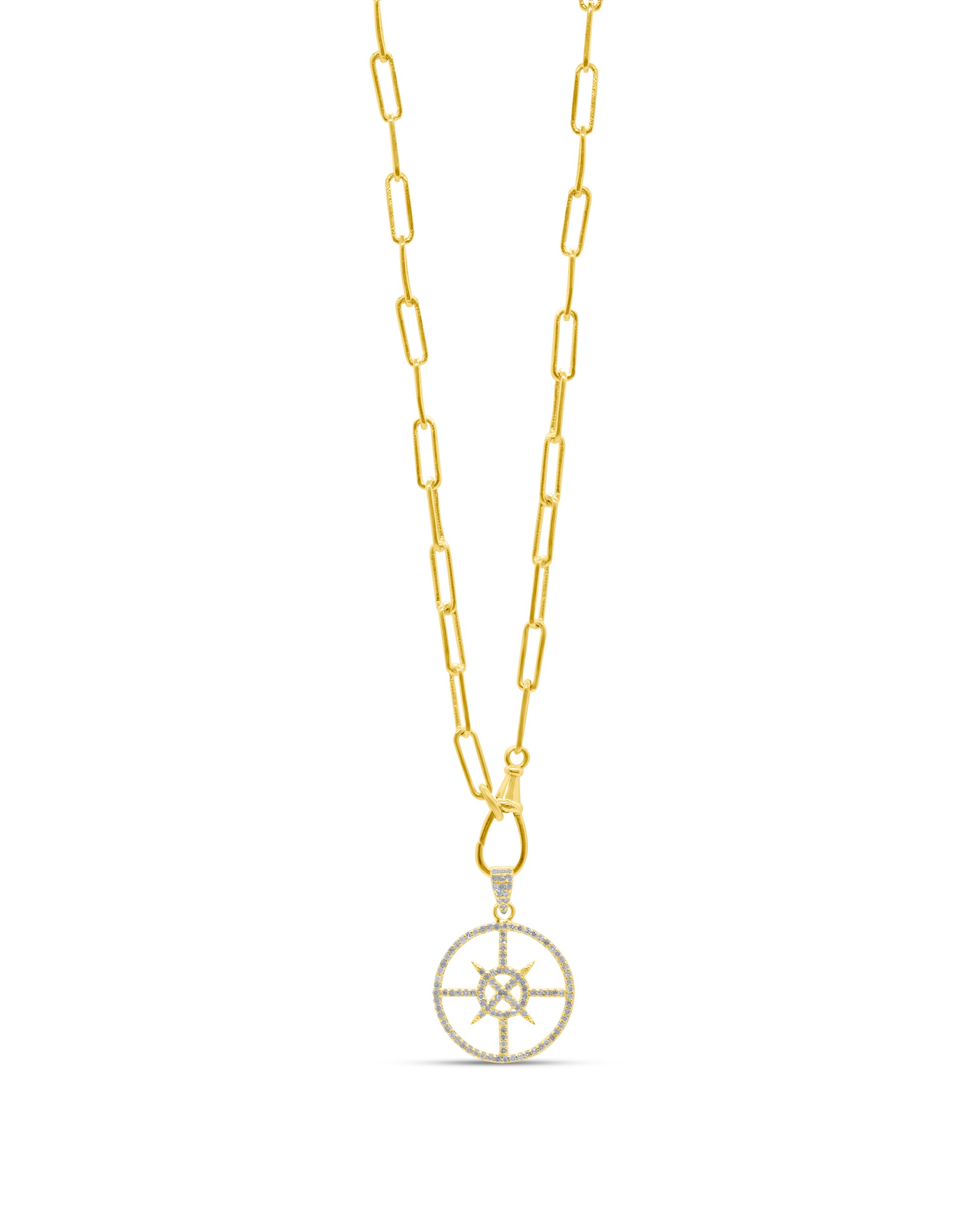 This piece was patterned after ironwork at Casa Golferichs, a 1901 building by Joan Rubió in Barcelona’s Eixample District, along the Gran Via de Les Corts Catalanes. The architect, Joan Rubió, was a protege of Gaudi. This Ironwork is seen over the building’s courtyard windows. The inner circle and crossing needles appear to float within the outer ring. The delicate pavé diamonds add elegence to any outfit. I love this with our Box Chain or our Diamond Bar Chain.
