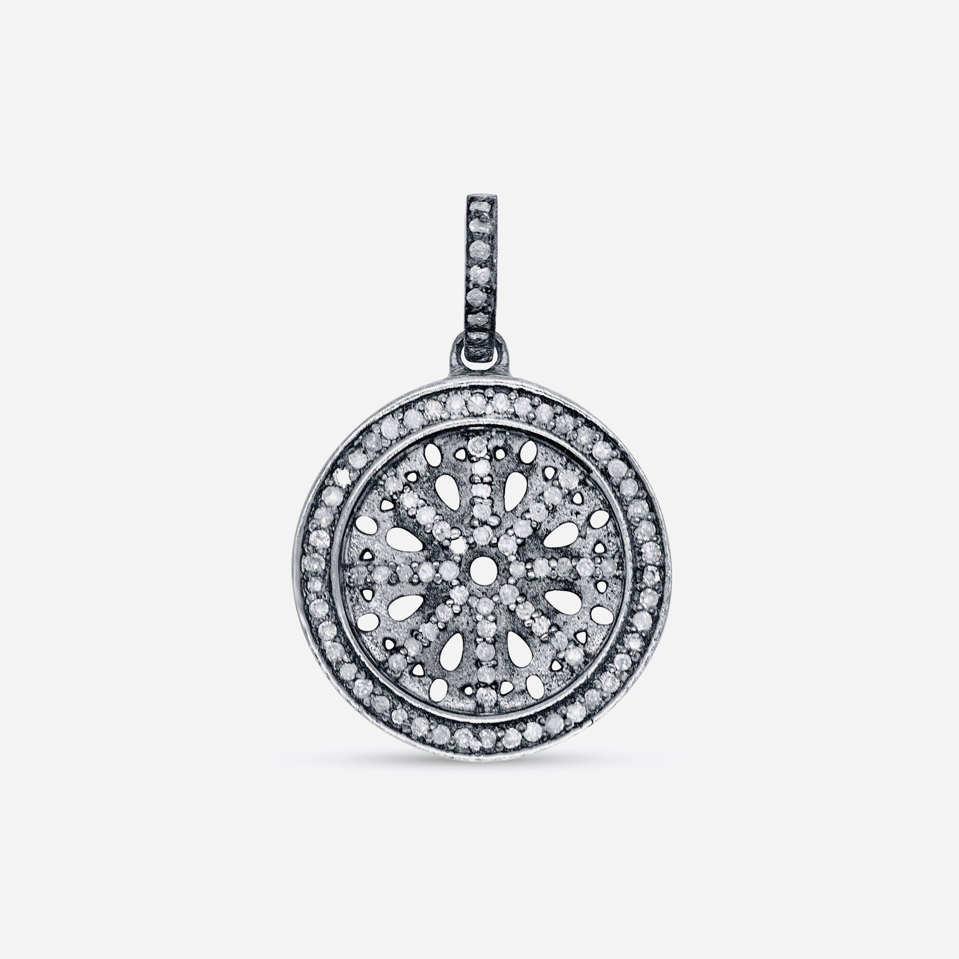 This pendant recalls my visit to the island of Ortigia in Siracusa, Sicily. It is a replica of the 15th century rose window of Chiesa di San Giovanni Battista (Church of St. John the Baptist) in the Piazza del Precursore. The window survived the 1693 earthquake that devastated 70 towns and cities in southern Sicily. This custom historical piece is so elegant and easy to wear with everything. This is such a luxurious piece with substantial weight. The diamonds throughout gives it a 3d look with its variations in thickness. Turn heads and inspire your style with this contemporary take on a classic church window. Effortlessly chic. Shown here with our everyday chain in oxidized sterling silver.