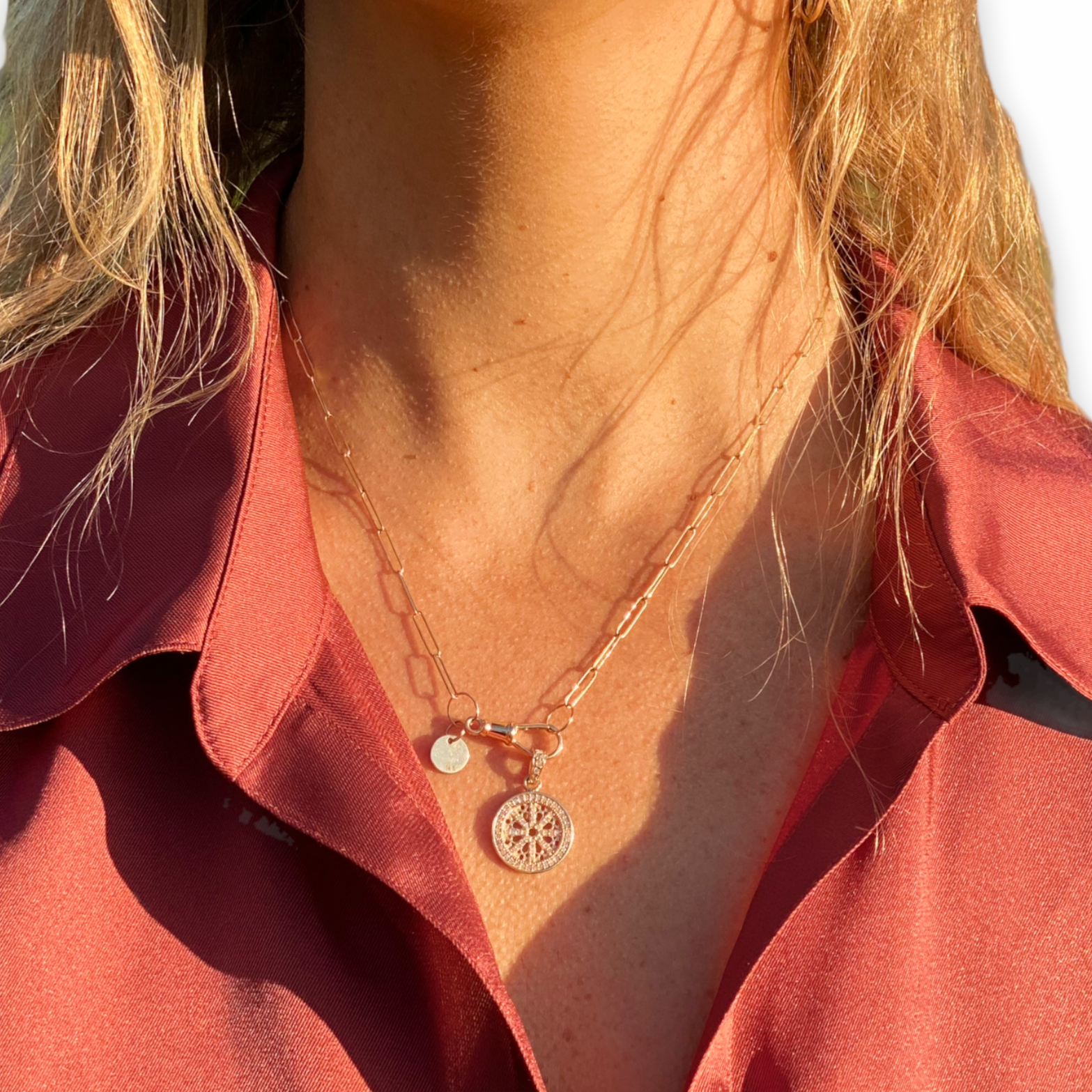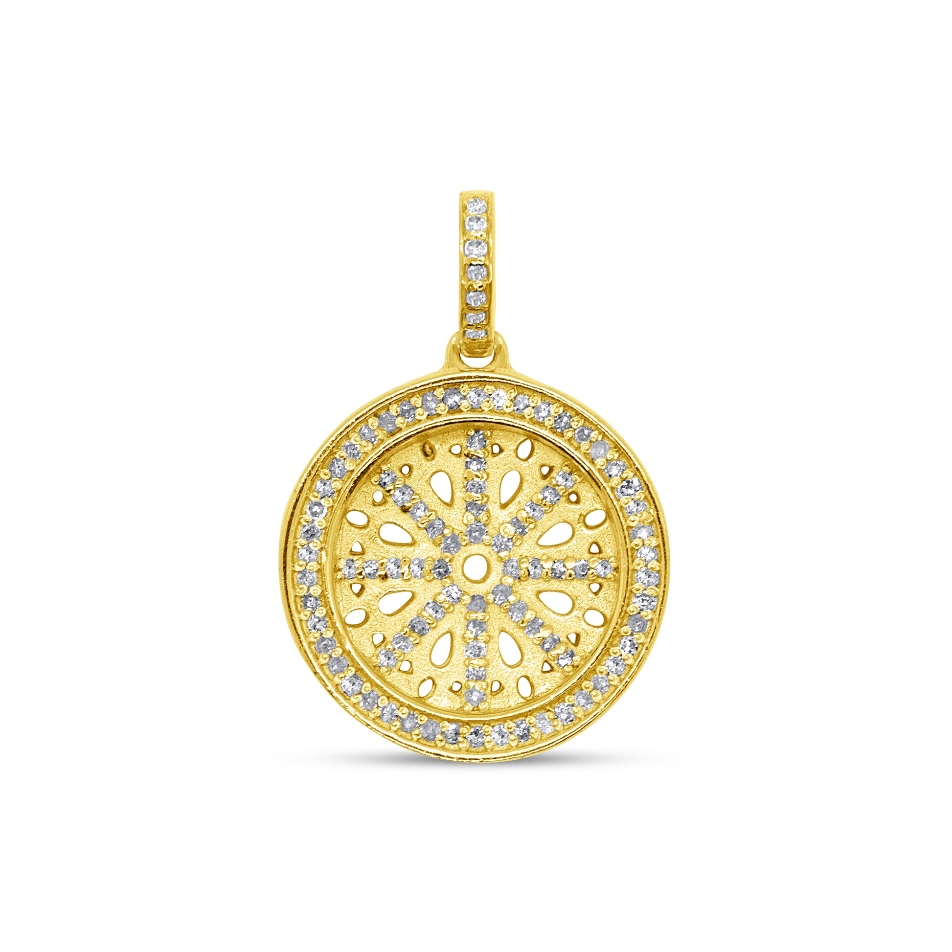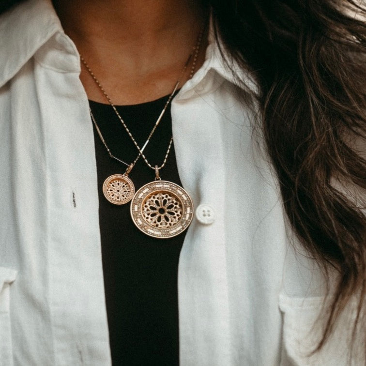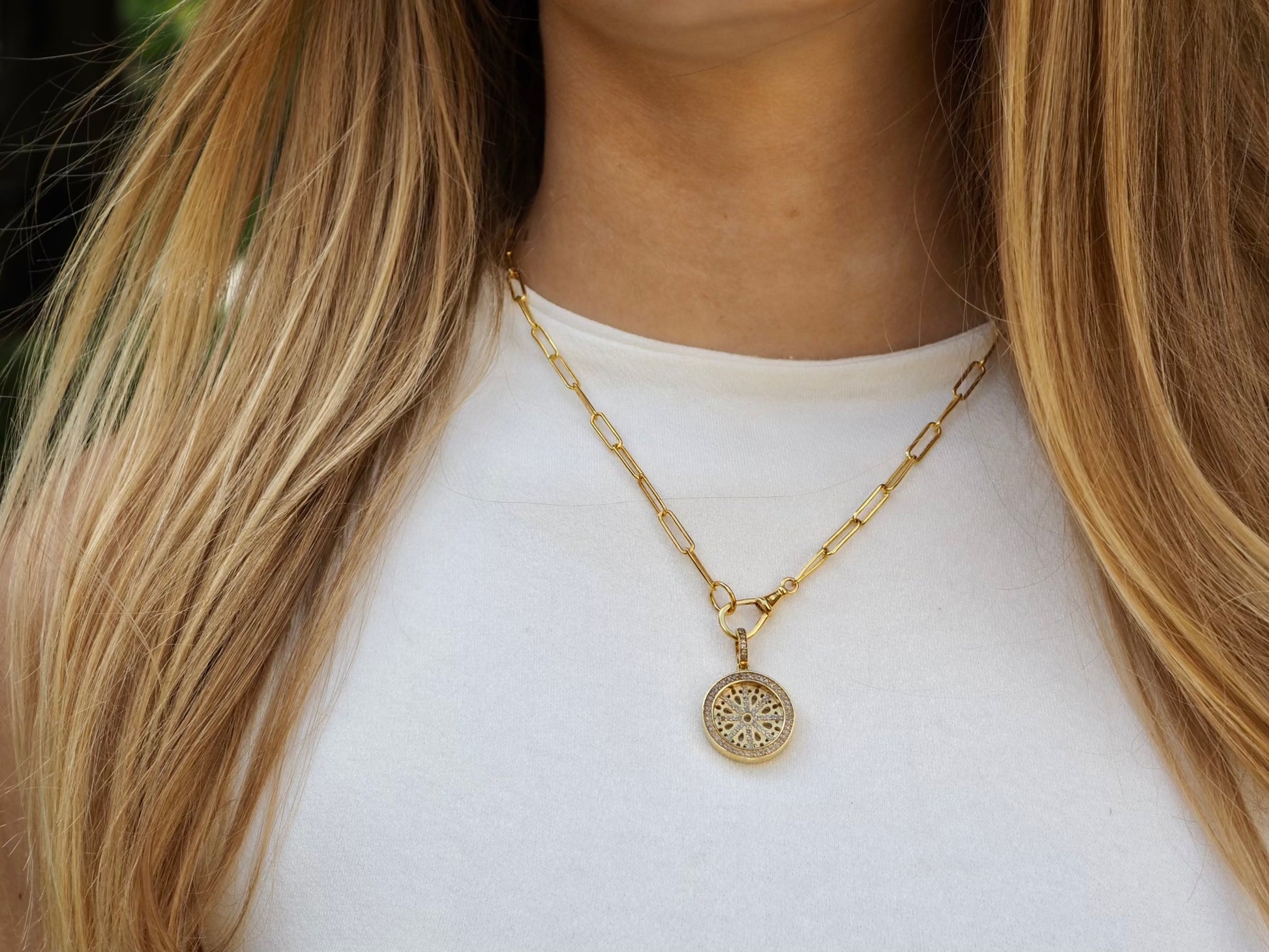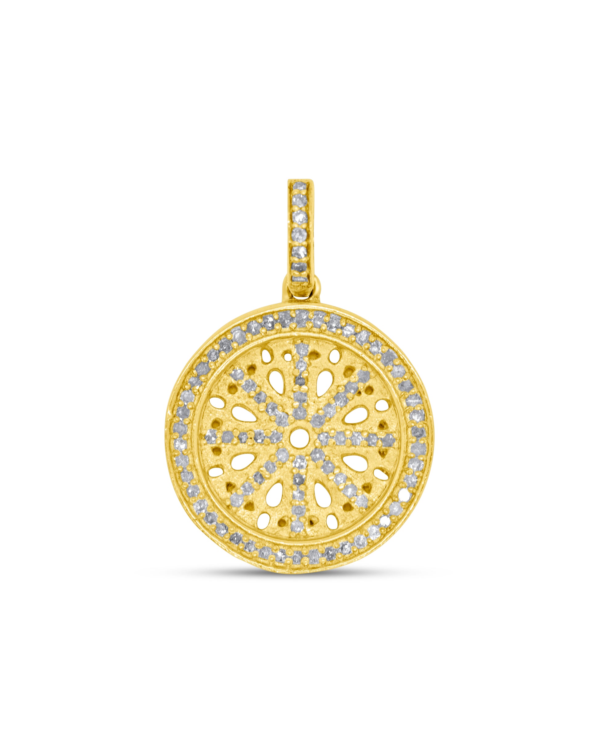 This pendant recalls my visit to the island of Ortigia in Siracusa, Sicily. It is a replica of the 15th century rose window of Chiesa di San Giovanni Battista (Church of St. John the Baptist) in the Piazza del Precursore. The window survived the 1693 earthquake that devastated 70 towns and cities in southern Sicily. This custom historical piece is so elegant and easy to wear with everything.  This is such a luxurious piece with substantial weight. The  diamonds throughout gives it a 3d look with its  variations in thickness.  We believe each jewel tells a story.  Turn heads and inspire your style with this contemporary take on a classic church window.  Effortlessly chic.  Shown here with our everyday chain in vermeil.