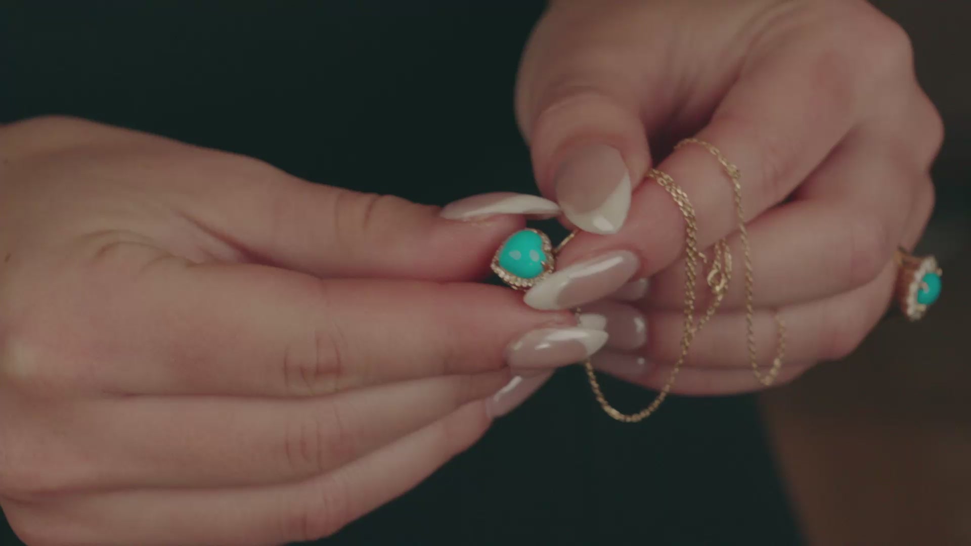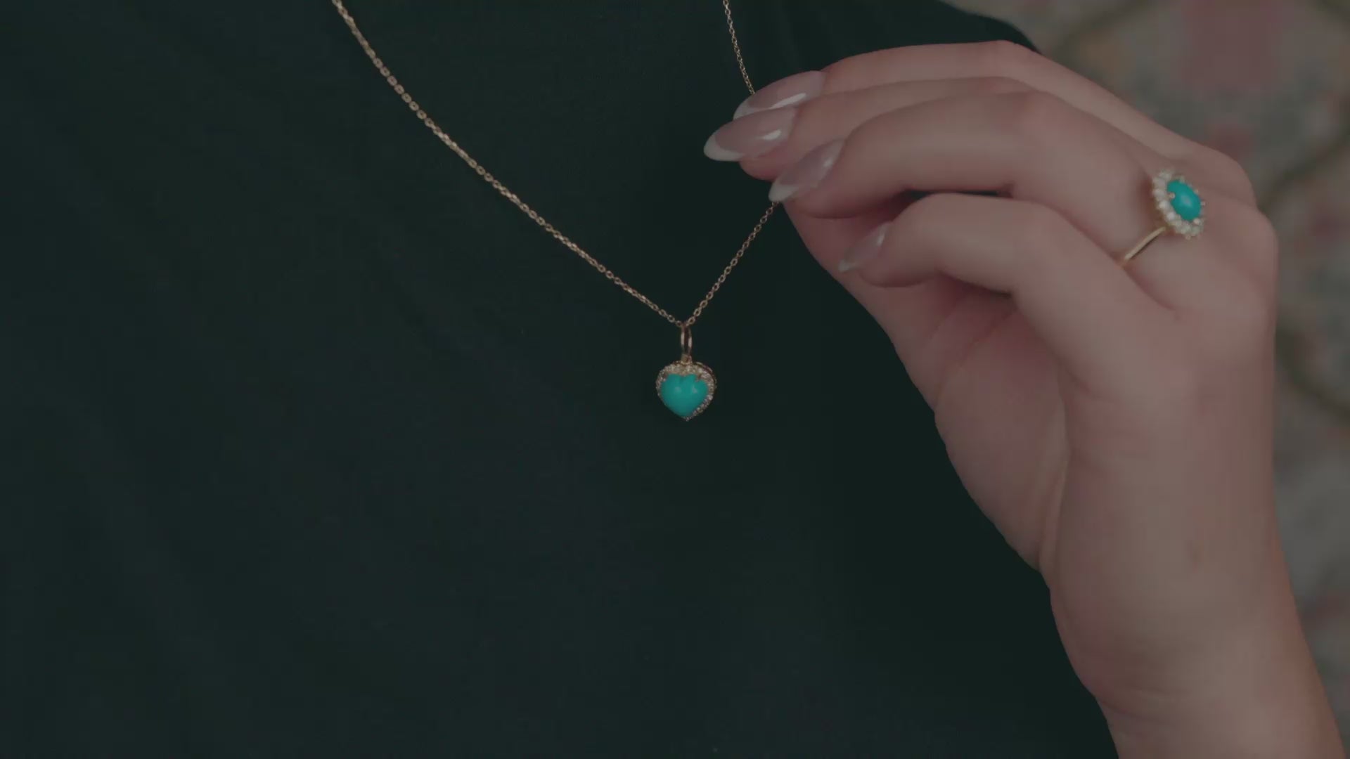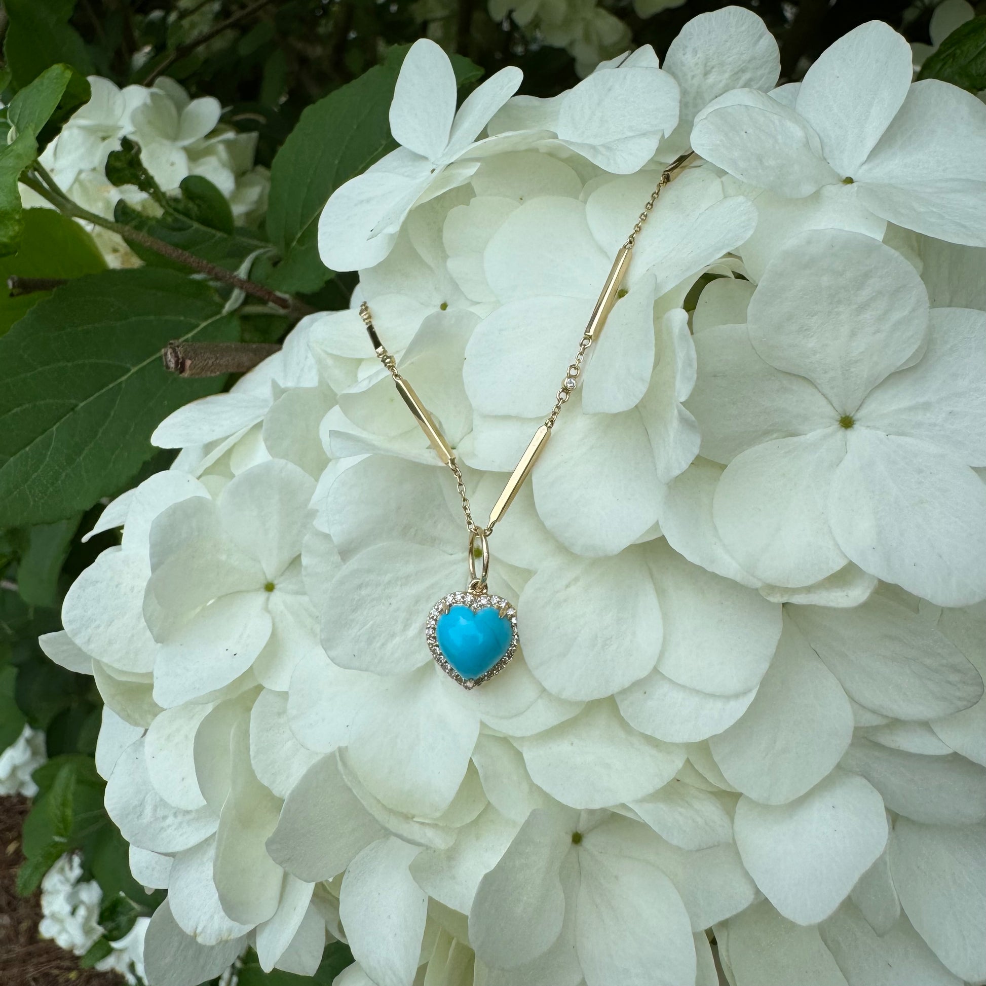 14k gold and diamond petite turquoise heart. 18mm. G .787g. D .11c. Tur 2.20c. Chains sold separately.