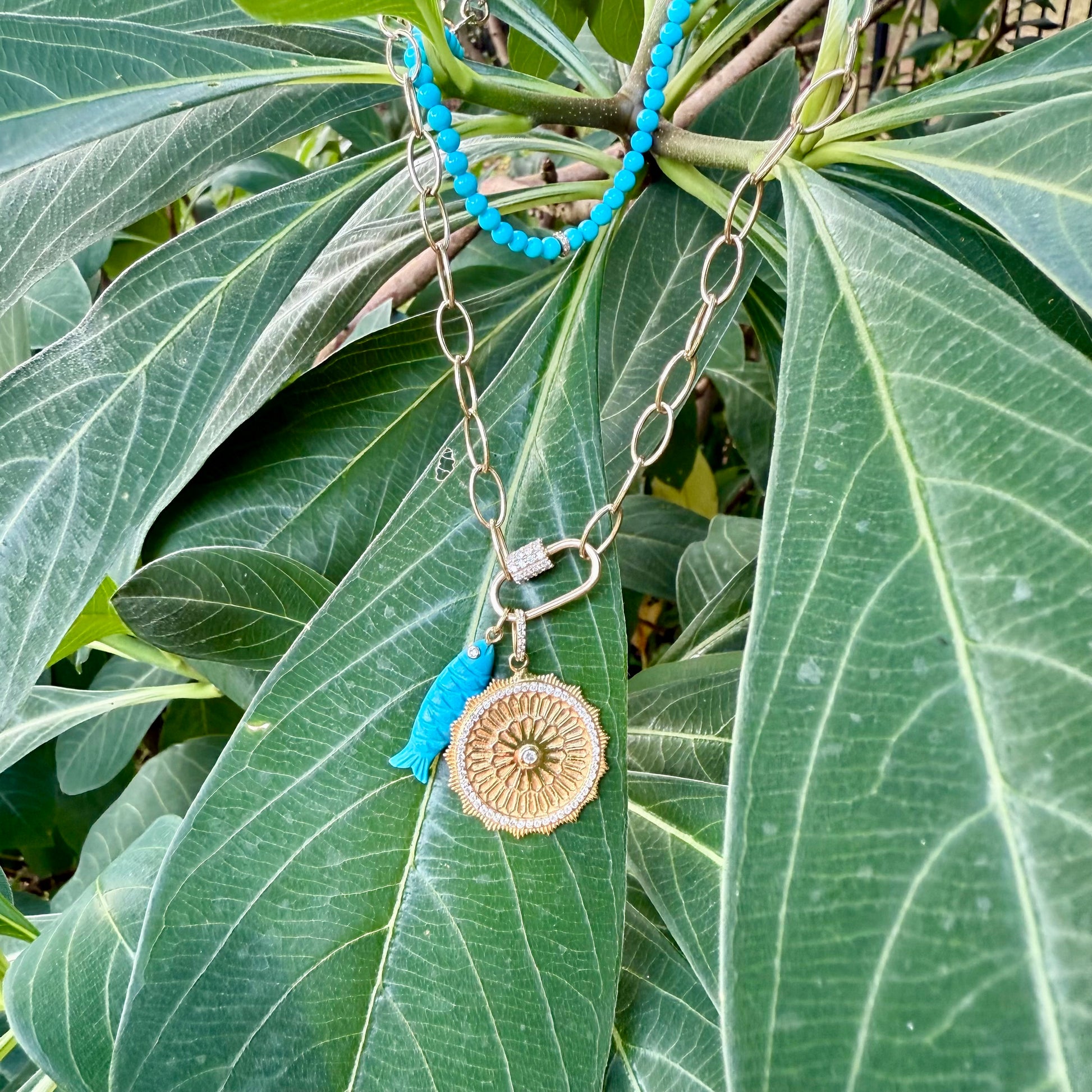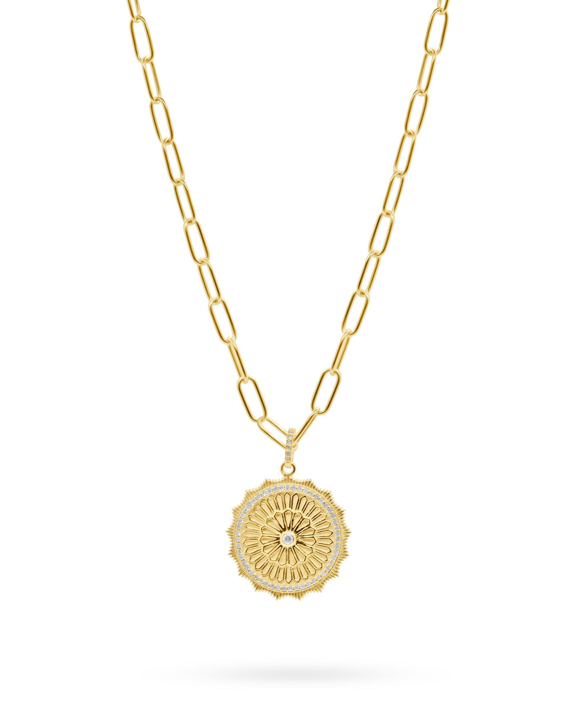 Memories of the City of Light and Notre-Dame Cathedral come to life in this bespoke pendant. Diamonds grace the center, outer ring and bail. Approximately 28 mm. Shown here with our Rounded Paperclip Chain. For a different look pair this with our 14K Gold Rolo Chain with a front clasp.