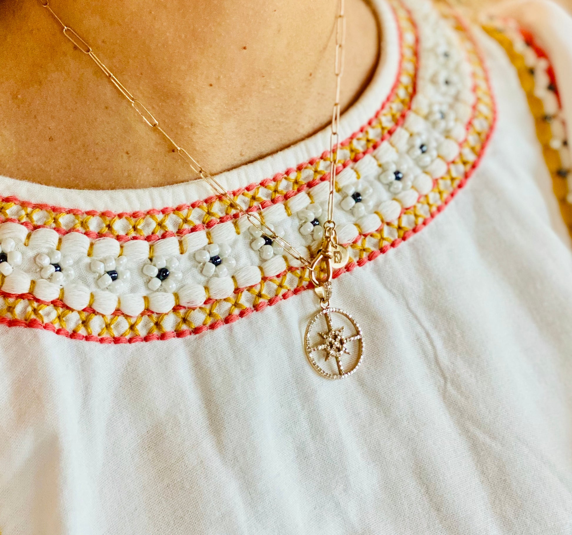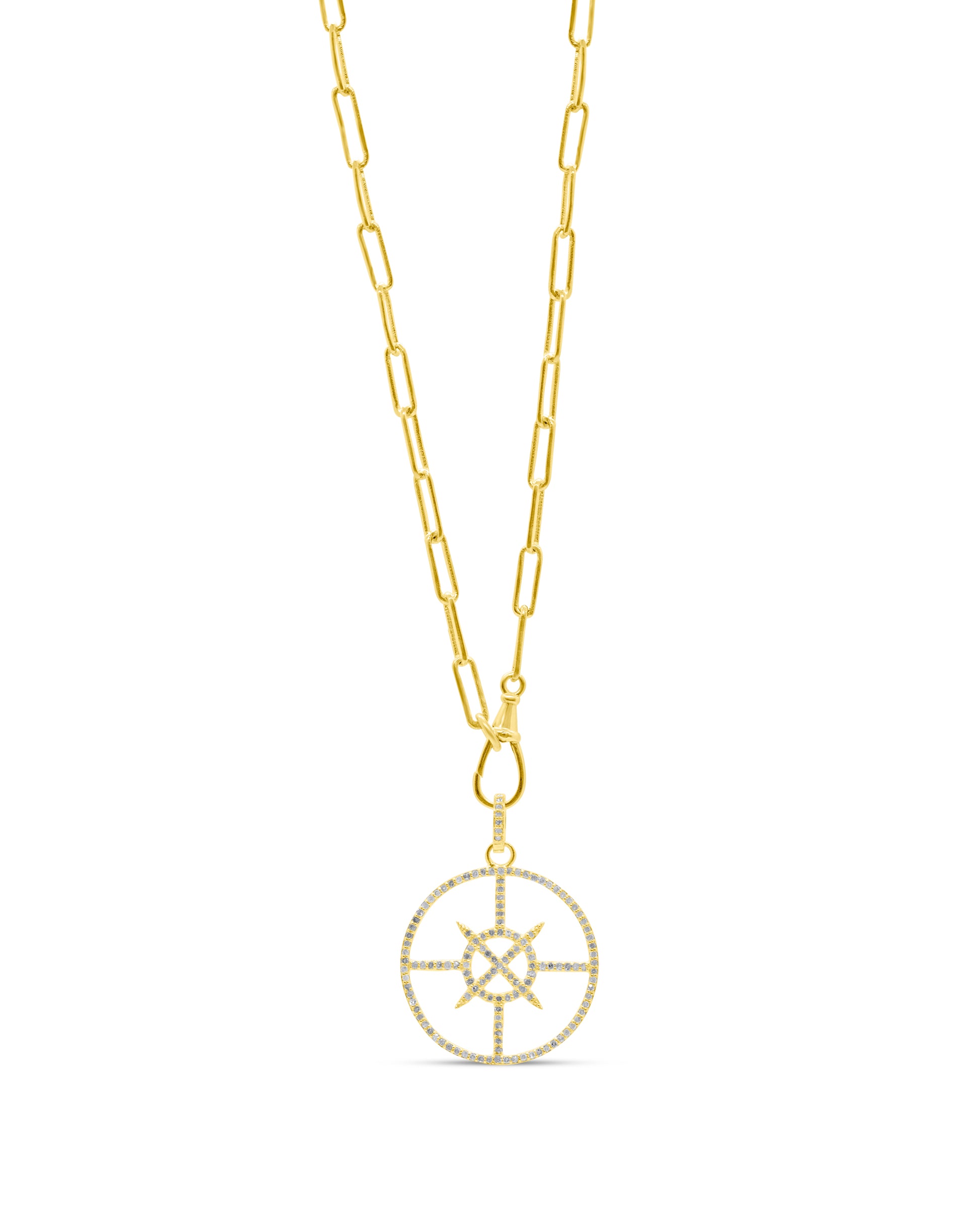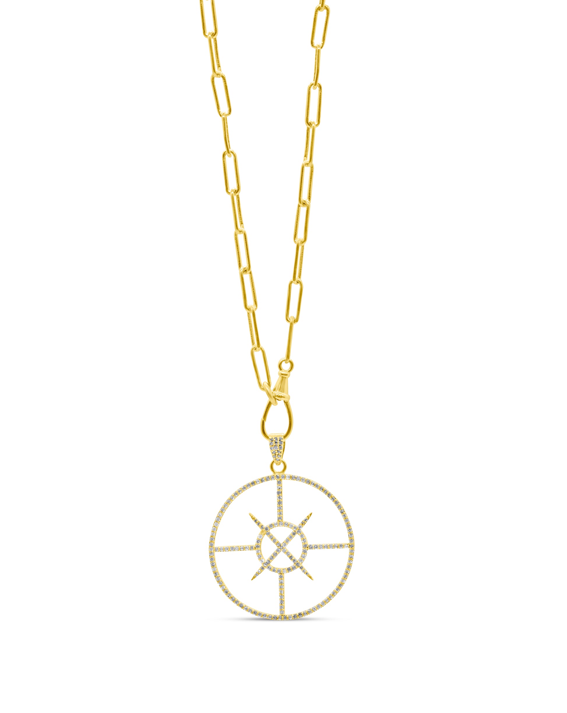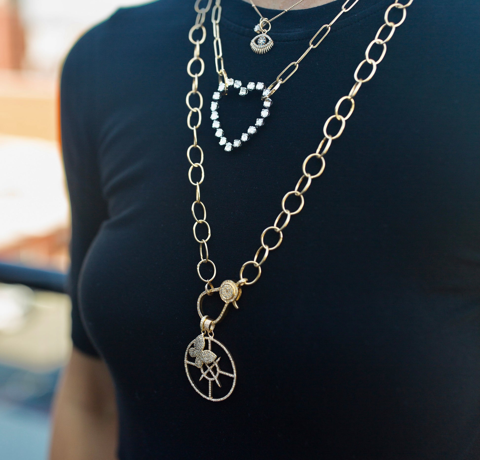 This piece was patterned after ironwork at Casa Golferichs, a 1901 building by Joan Rubió in Barcelona’s Eixample District, along the Gran Via de Les Corts Catalanes. The architect, Joan Rubió, was a protege of Gaudi. This Ironwork is seen over the building’s courtyard windows. The inner circle and crossing needles appear to float within the outer ring. Delicate, yet substantial with its pavé diamonds, the Barcelona will add elegance to any outfit. The small (24mm) and medium (30mm) are shown here with our Everyday Paperclip chain. The large (36mm) is shown here with our Vermeil Oval Chain with Heart Diamond Clasp.