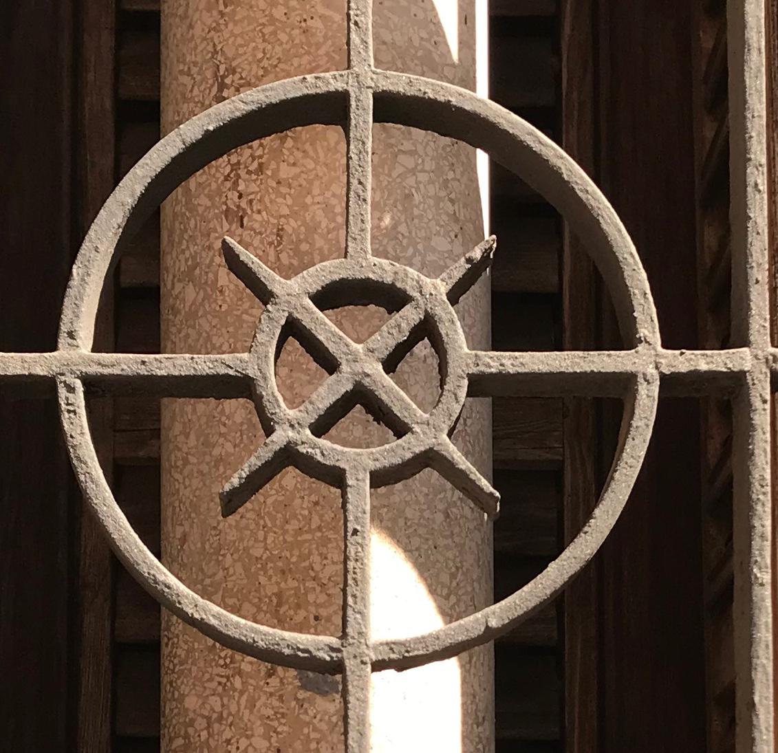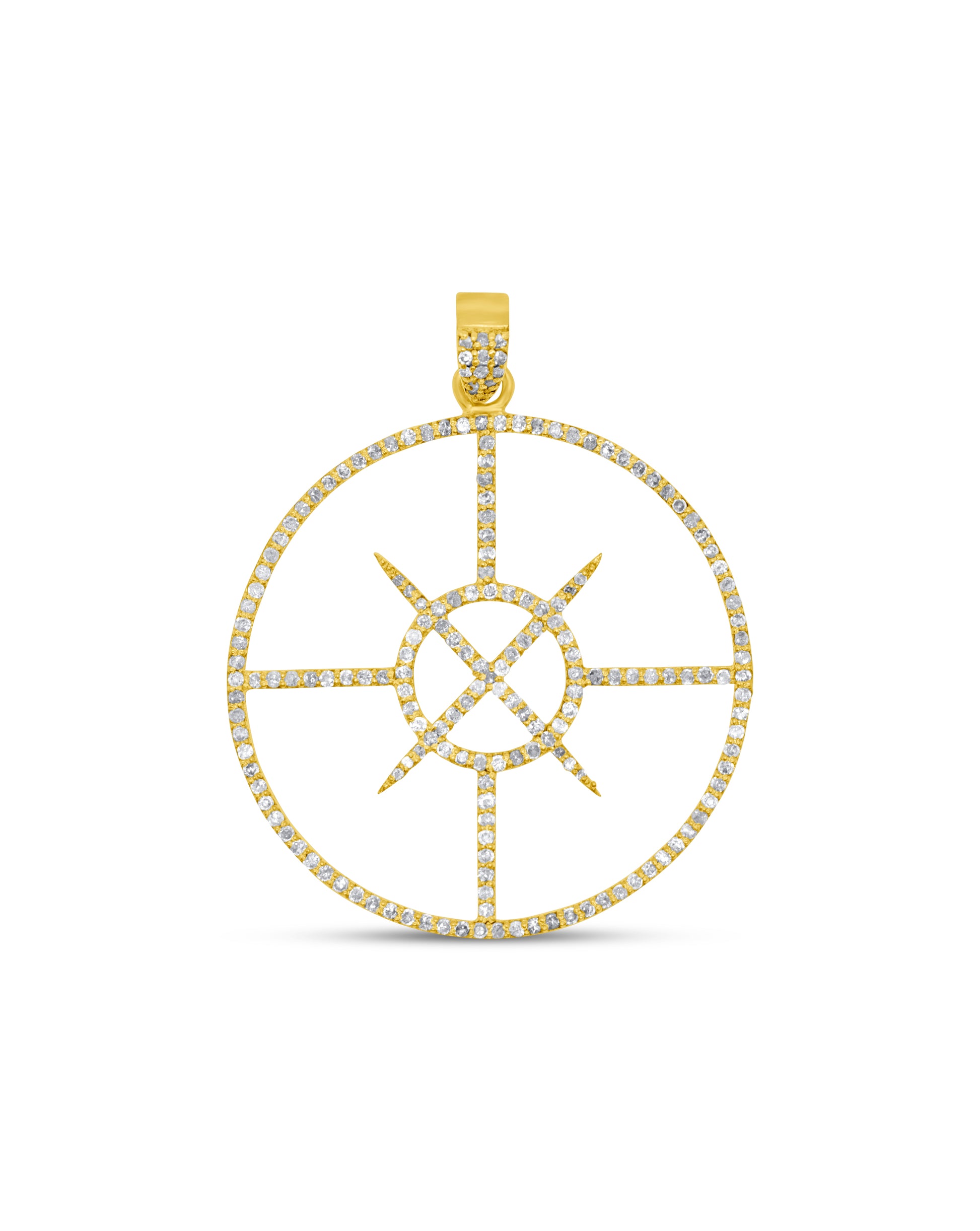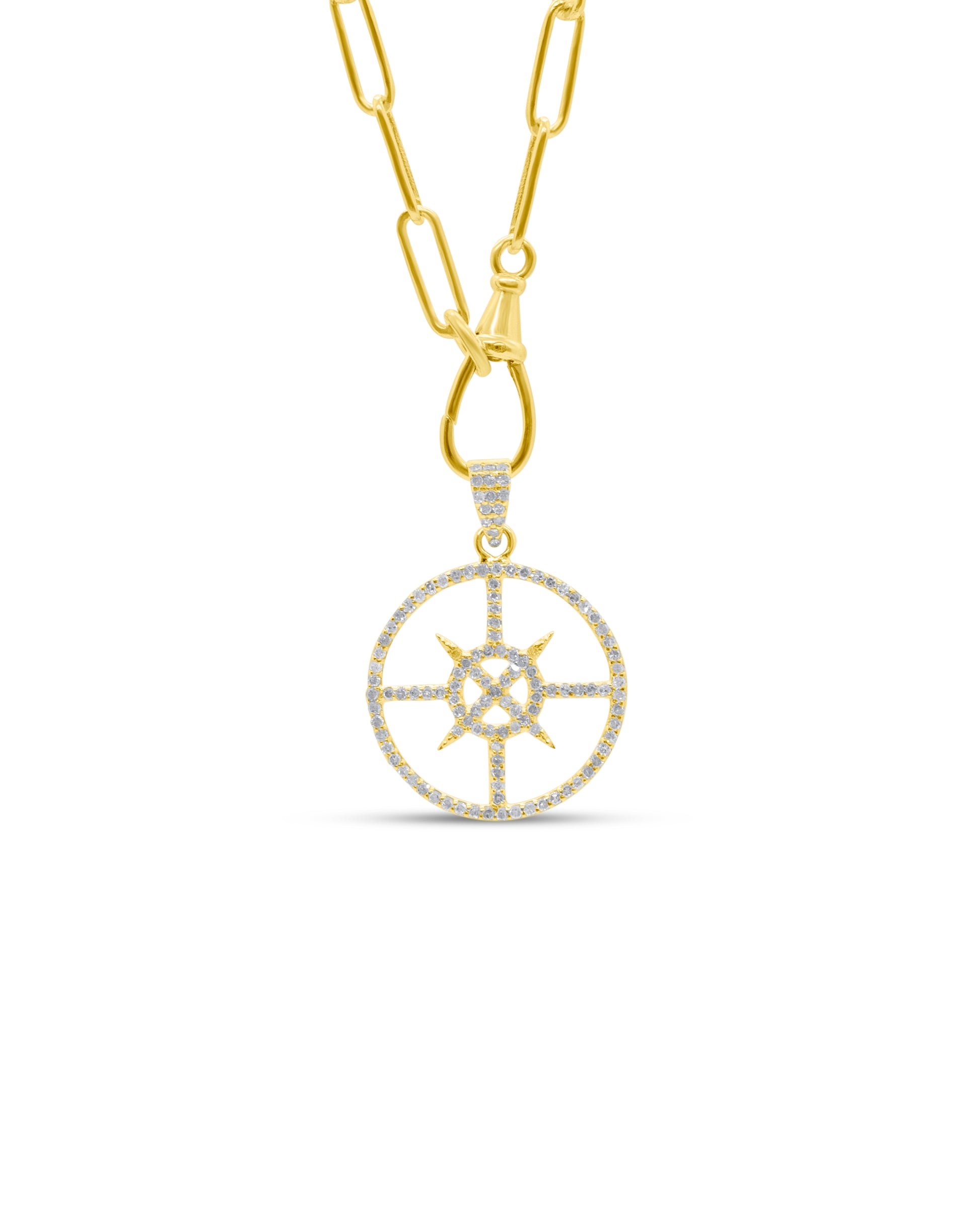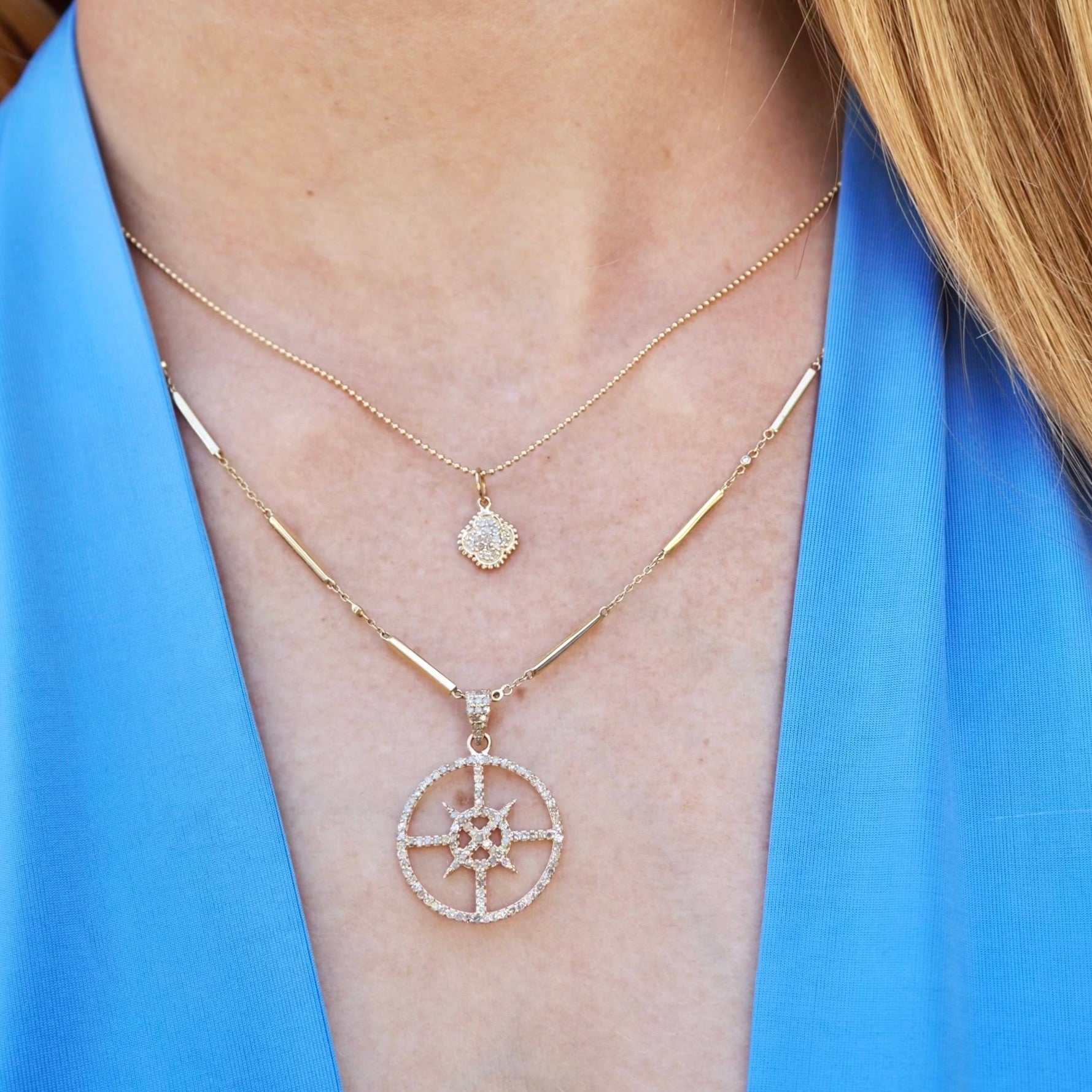 This piece was patterned after ironwork at Casa Golferichs, a 1901 building by Joan Rubió in Barcelona’s Eixample District, along the Gran Via de Les Corts Catalanes. The architect, Joan Rubió, was a protege of Gaudi. This Ironwork is seen over the building’s courtyard windows. The inner circle and crossing needles appear to float within the outer ring. Delicate, yet substantial with its pavé diamonds, the Barcelona will add elegance to any outfit. The small (24mm) and medium (30mm) are shown here with our Everyday Paperclip chain. The large (36mm) is shown here with our Vermeil Oval Chain with Heart Diamond Clasp.
