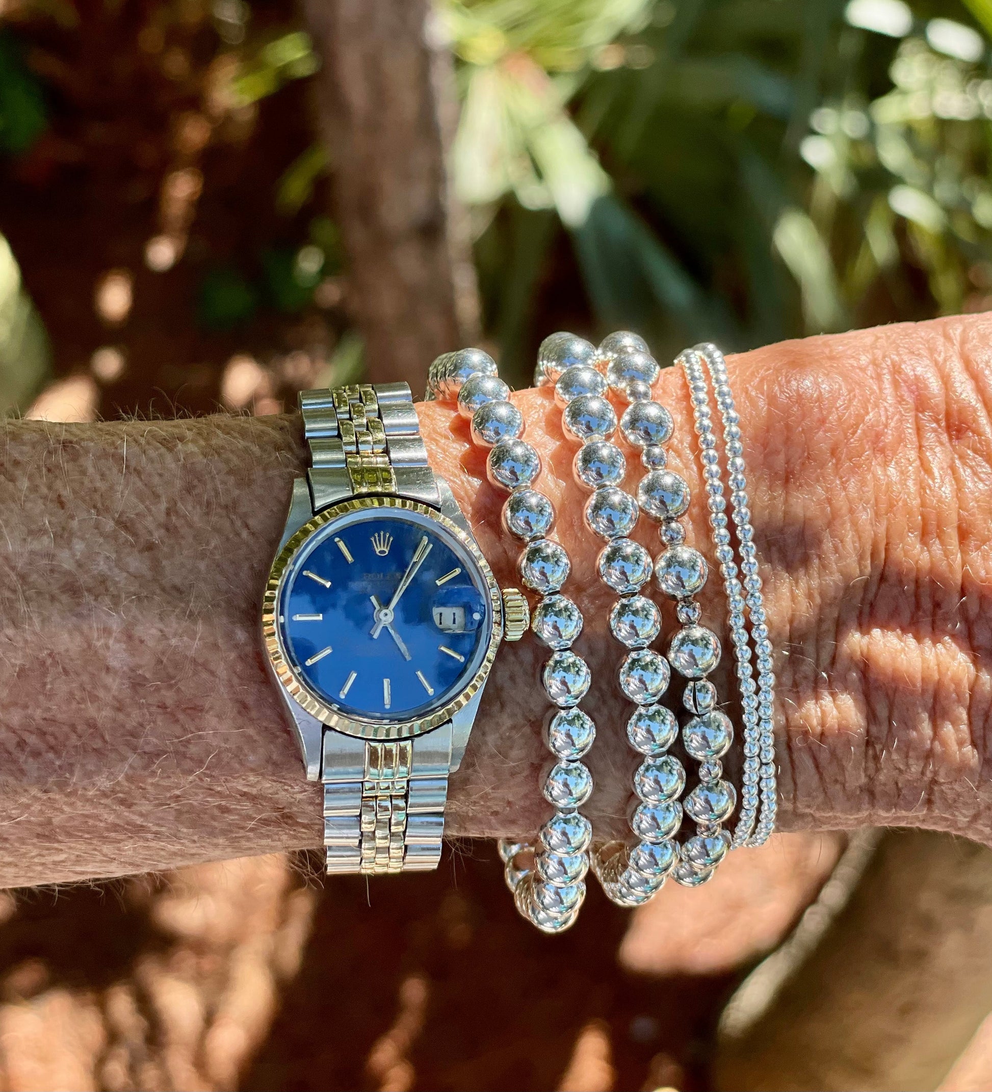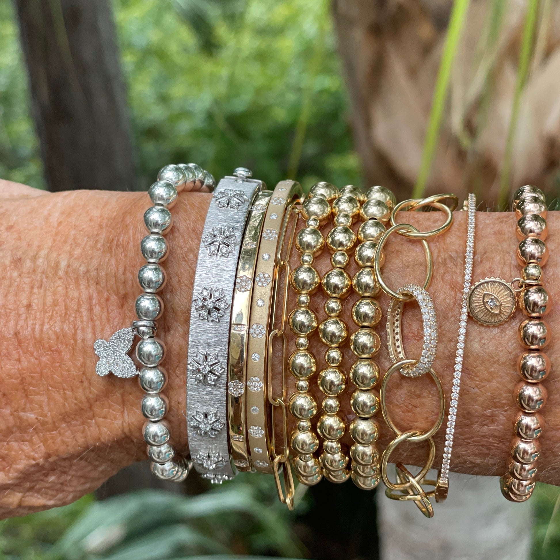 Perfect everyday Bead Stacking Bracelets for comfort and easy on. These can be customized with any of our charms. Typical size is 6.5 inches and fits most people. They stretch for comfort. We stack these with our oval link diamond bracelet for a polished look. These beautiful bracelets can also be ordered in 14K Gold, Gold Filled, Rose Gold Filled, and Sterling Silver. These are 6mm beads but can be special ordered in other sizes:5mm, 4mm, and 3mm.