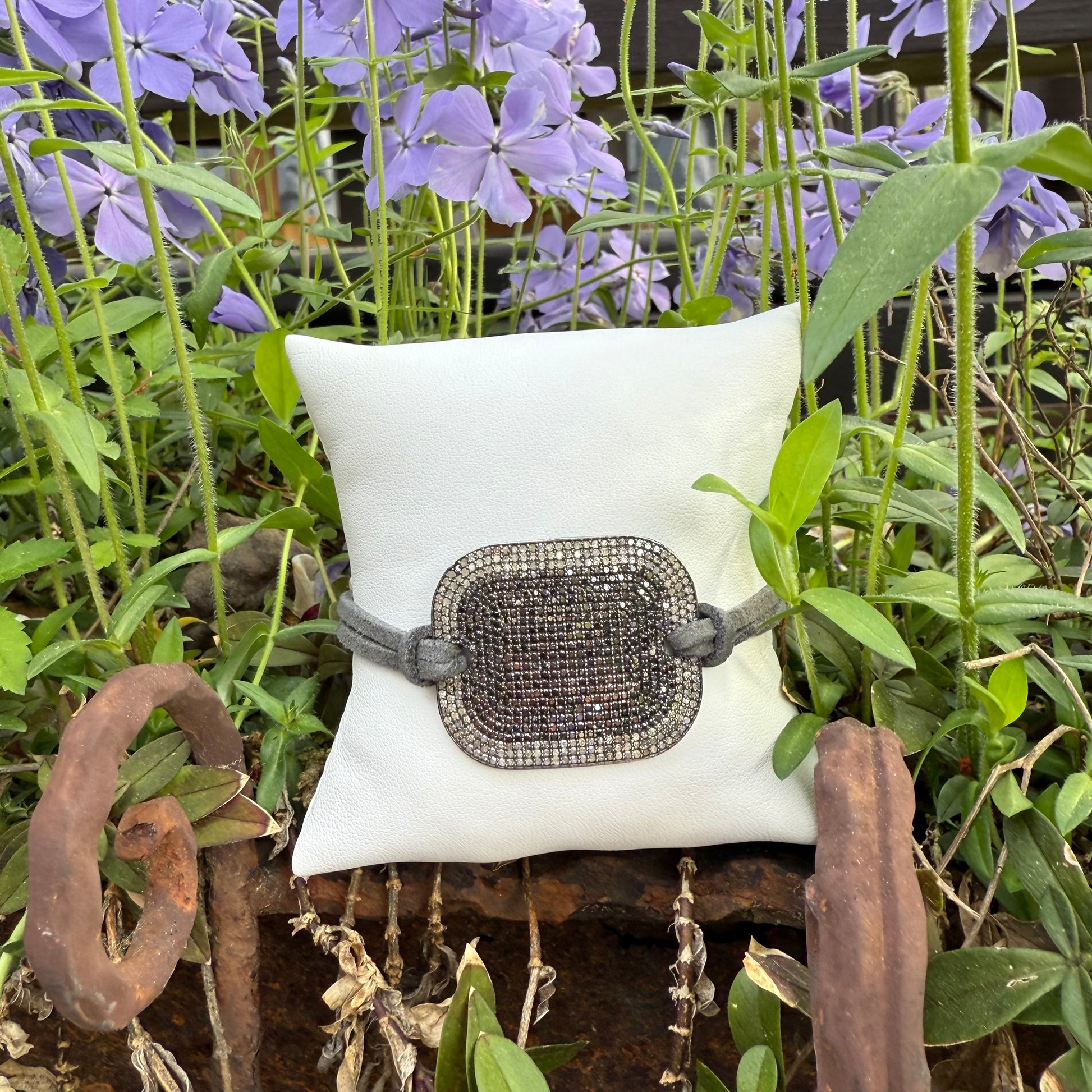 Beautiful black and white diamond cuff. Approximately 30mm by 35mm. Easy closure in back by pulling diamond rondelle over the leather.