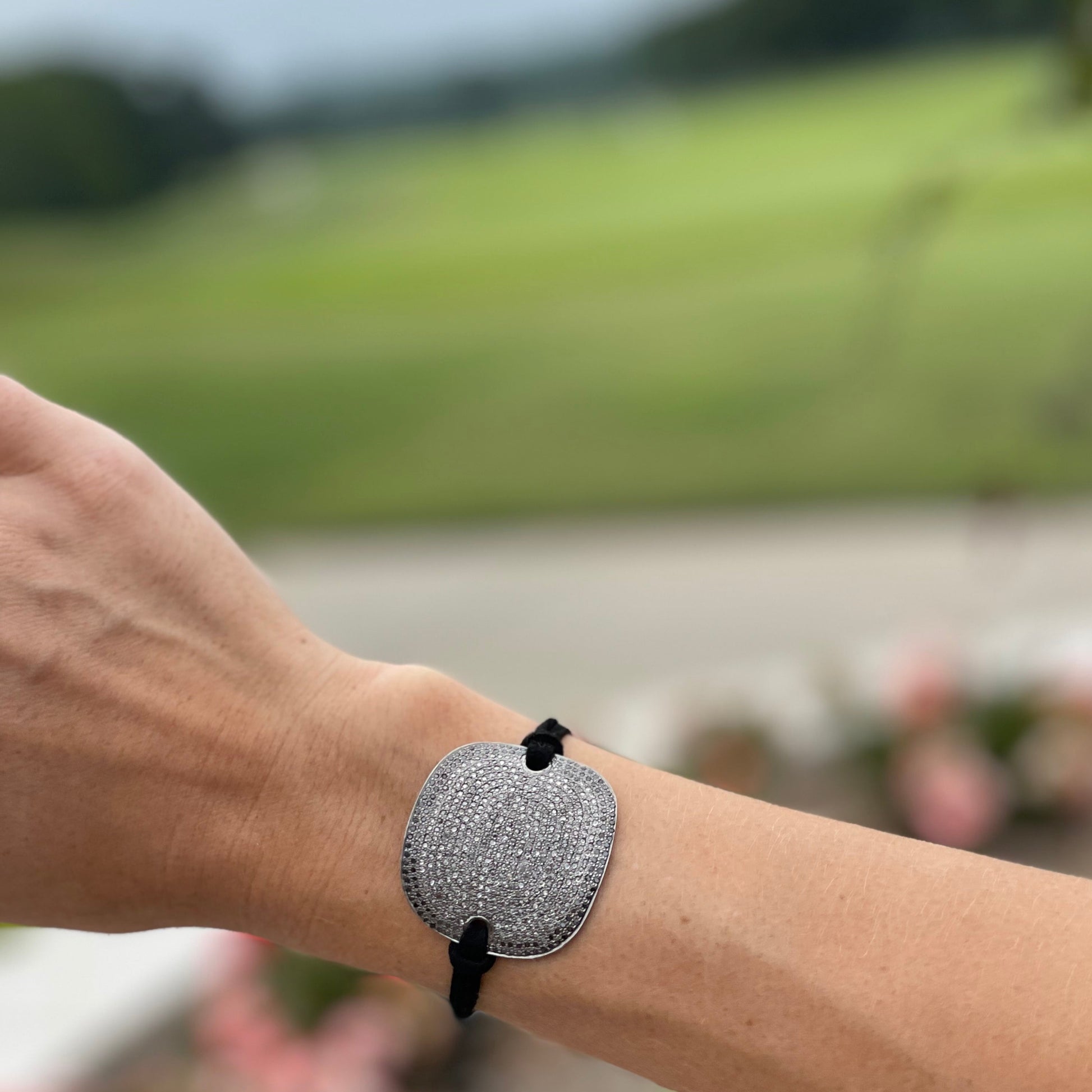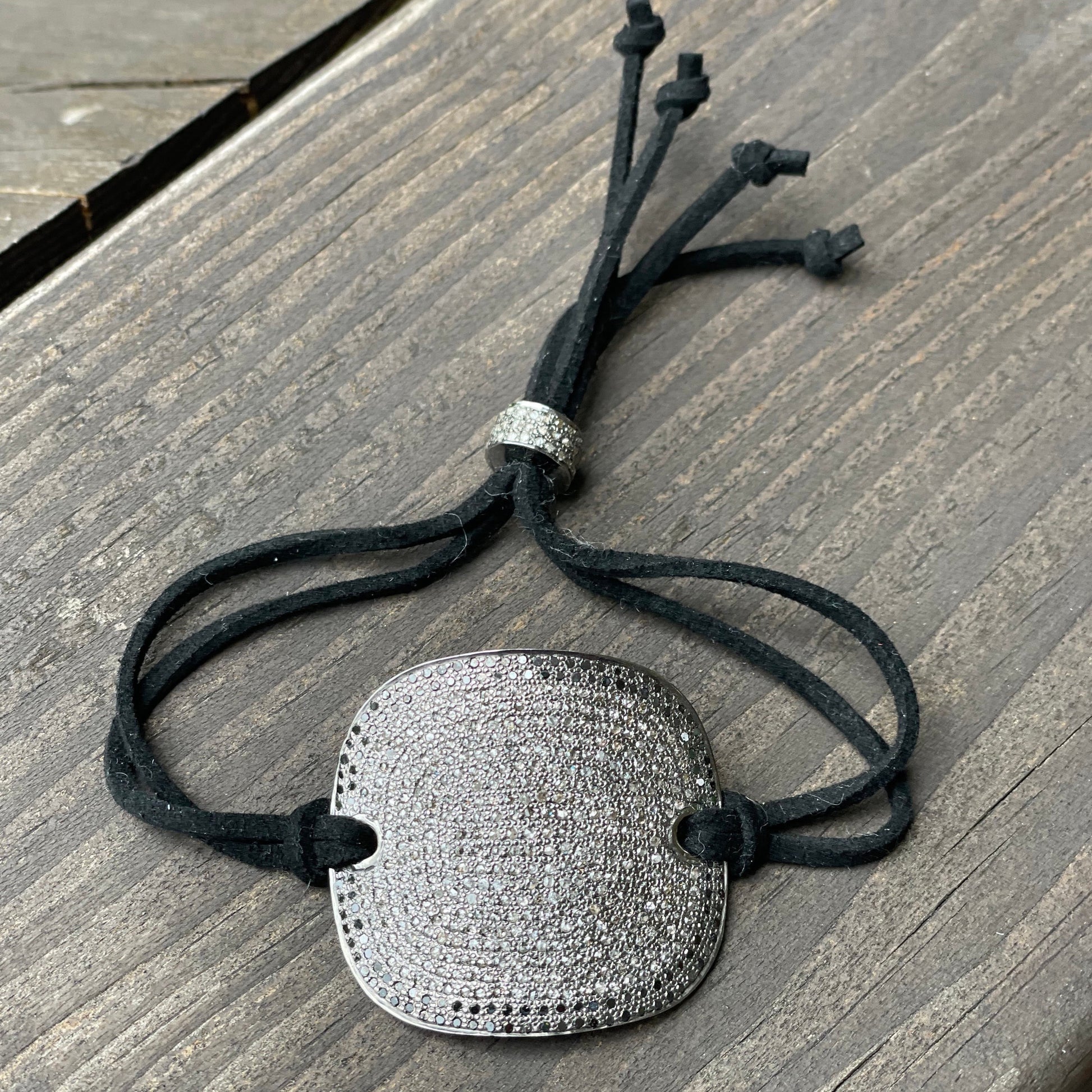 Our Diamond Square Cuff bracelet is sterling silver with two black outer rows of diamonds and white hand set diamonds throughout. Approximately 40mm by 35 mm and curved in the back to fit a smaller wrist. The closure is a pull closure with pave diamonds for easy on and off. Leather color can be changed.