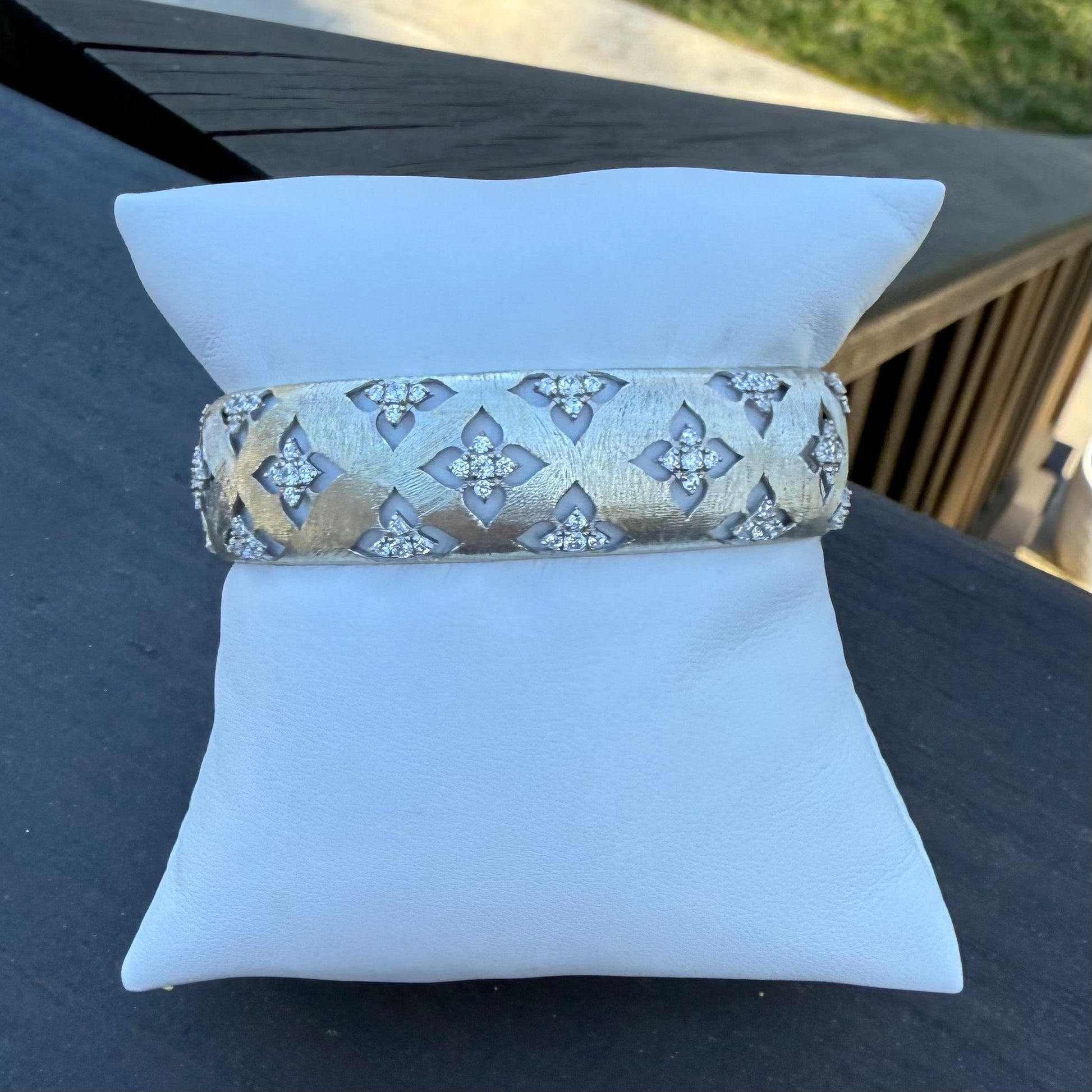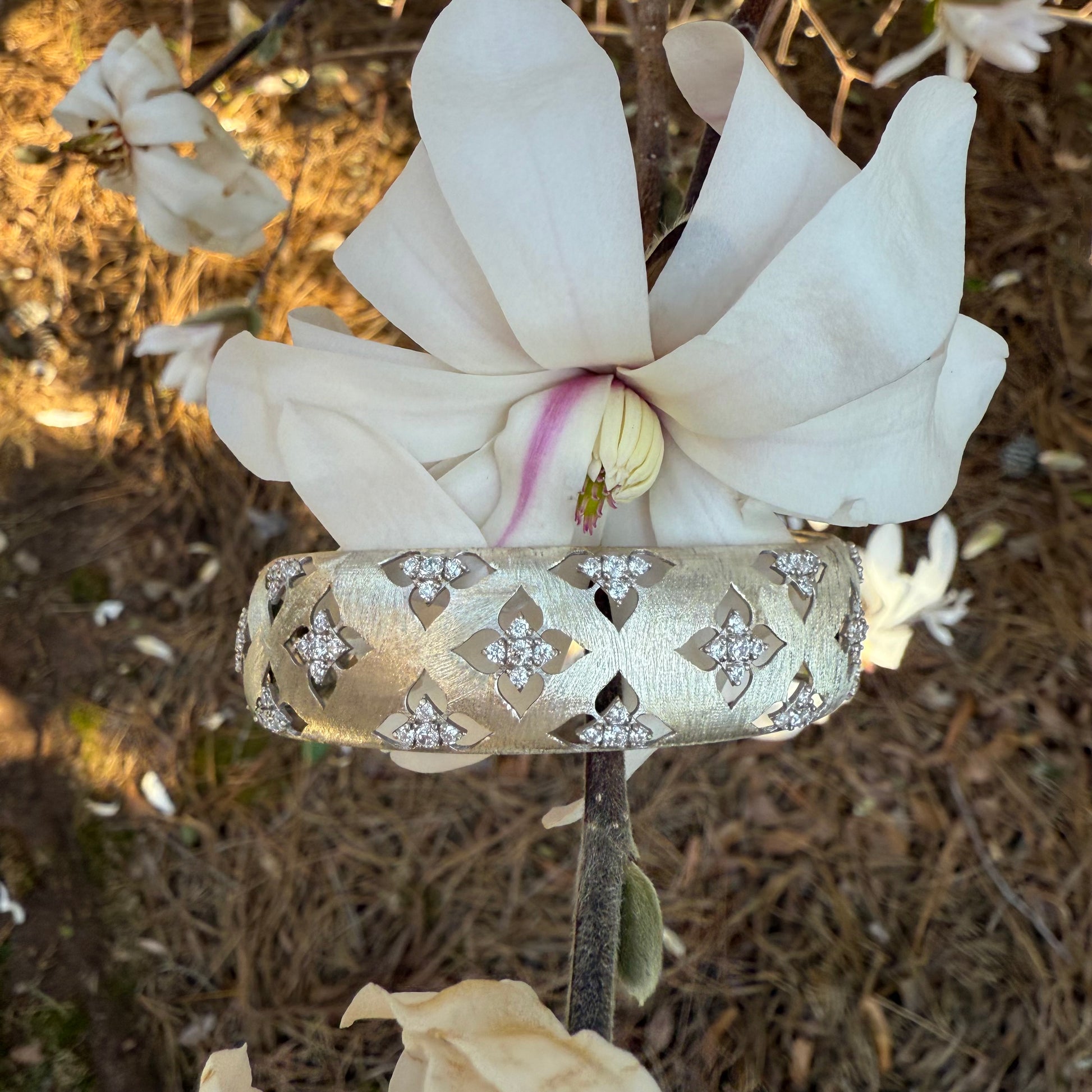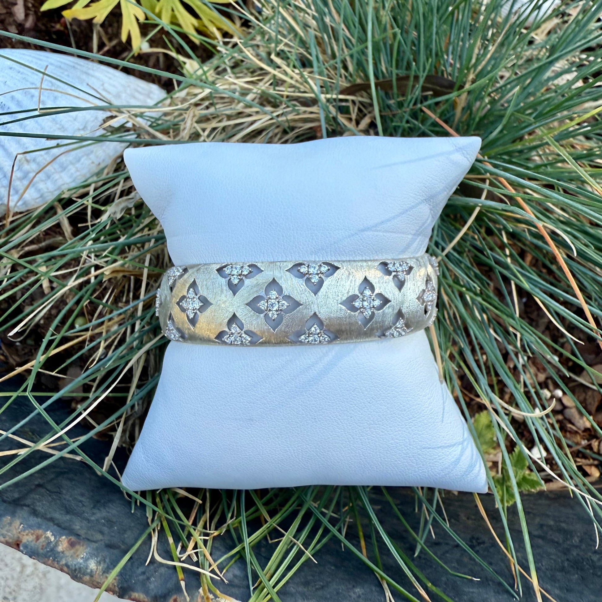 Diamond Cuff with Moorish accents. Approximately 1.25 inches across. 925 Sterling brushed finish.