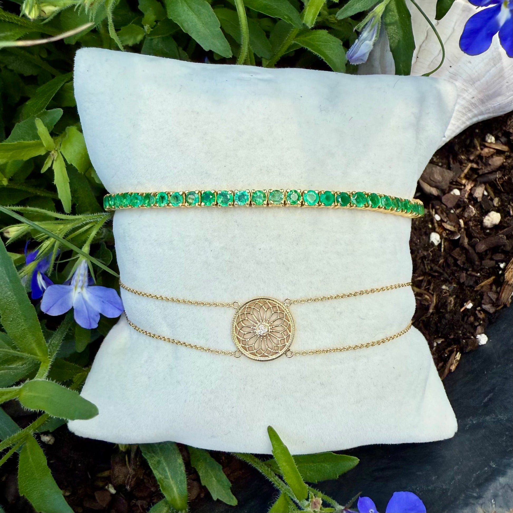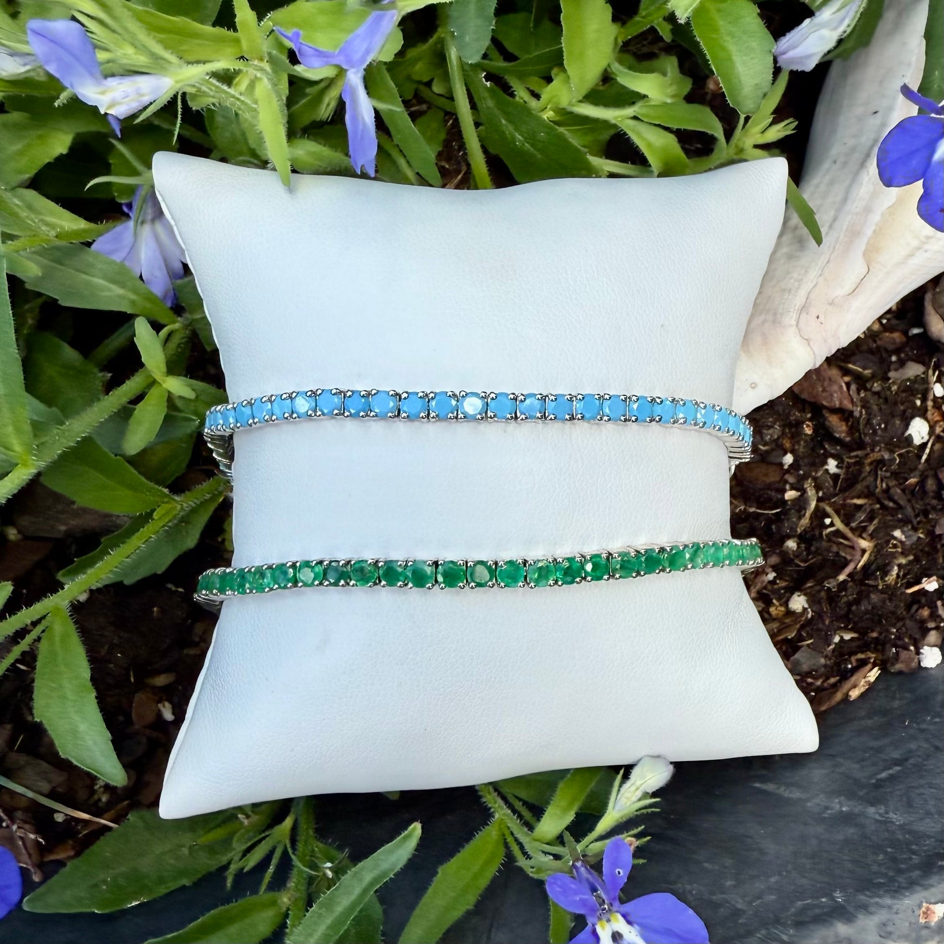 These gemstone adjustable bracelets will be your favorite piece for spring. They are a new take on the tennis bracelet, but they are adjustable with paper clip chain in the back. The bracelet shown here is stunning emeralds in a vermeil setting. Adjustable 6.75, 7.25 and 7.50.