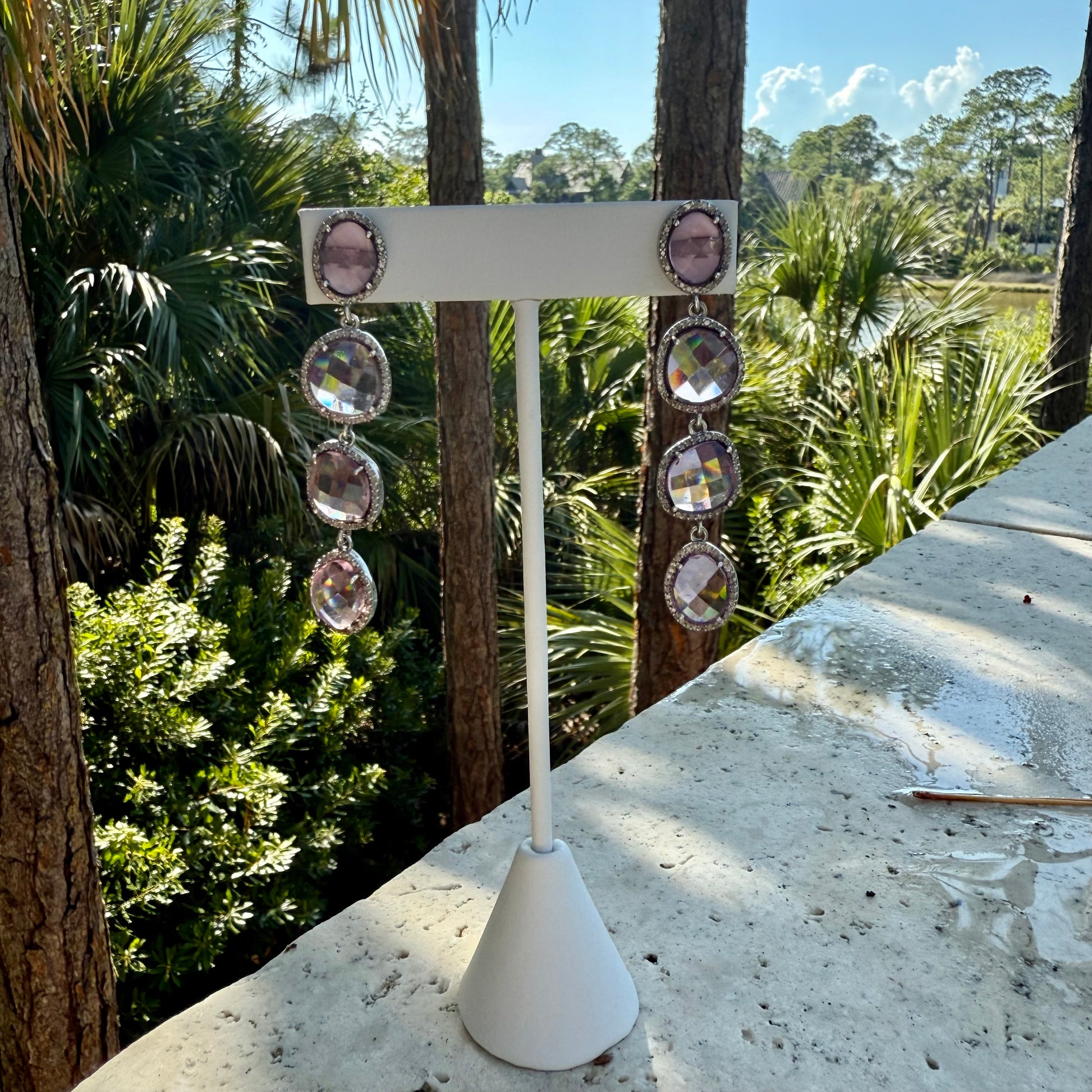 Summer for your ears, our gemstone drops are surrounded by diamonds. Approximately 2 inches long. Gemstones approximately 8mm to 10mm around. The baby pink quartz are slightly larger around, approximately 12 to 15mm. Natural gemstones in organic sizes. Very lightweight.