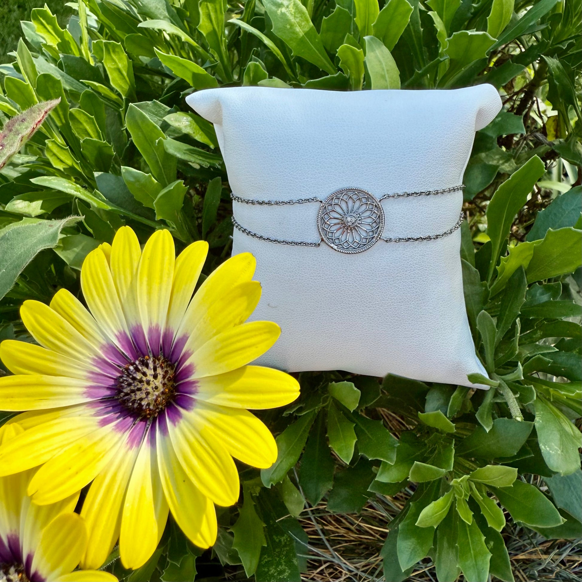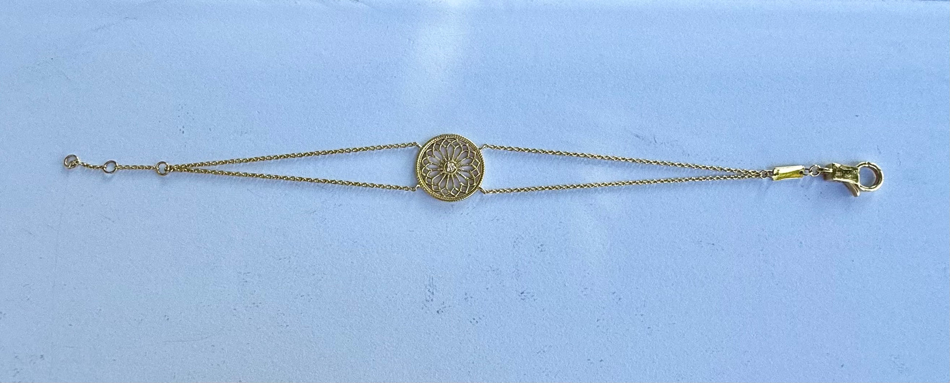 This delicate bracelet was inspired by the Duomo di Como, a catholic cathedral in Lake Como, Italy. The center charm is approximately 16.50mm. The center has an open 3 leaf clover, like the Cathedral. Easy to open modern lobster clasp that adjusts at 6.5, 7 and 7.5 inch. A great addition to your arm stack.