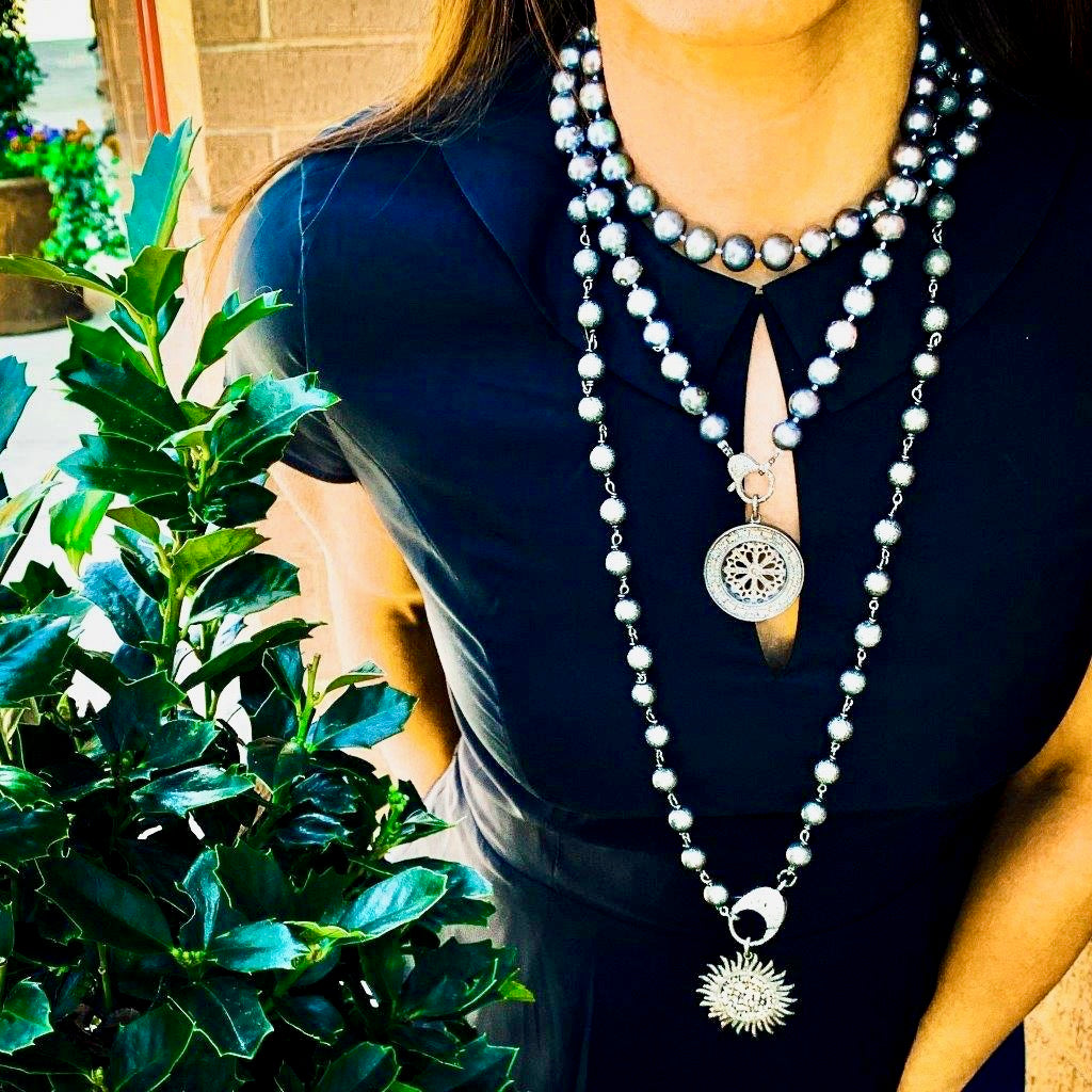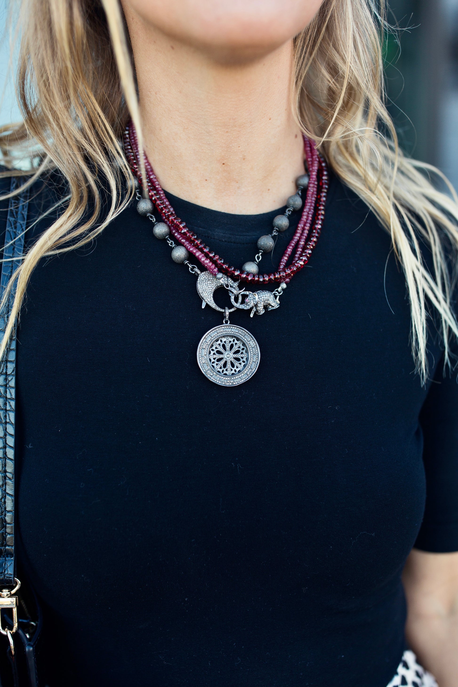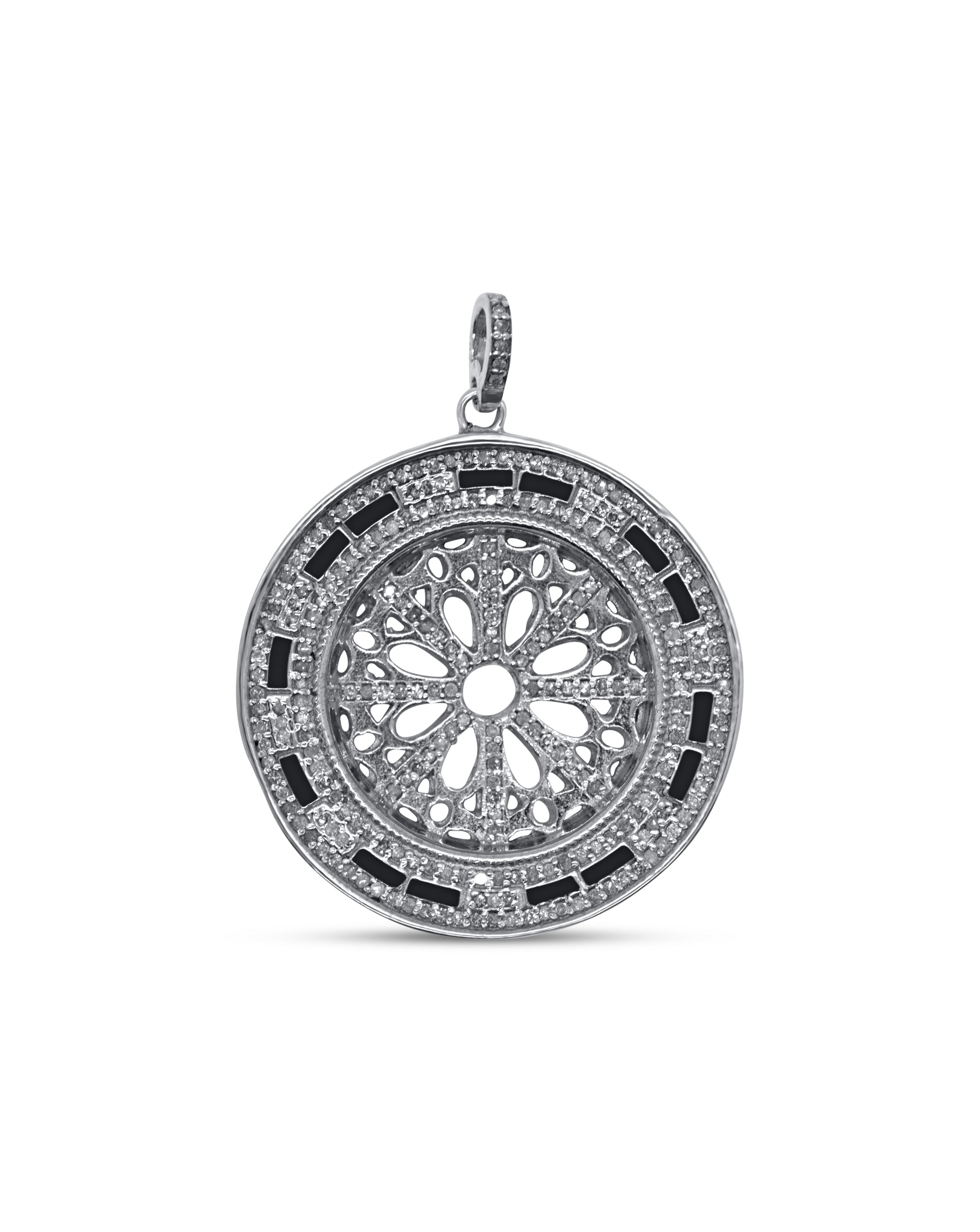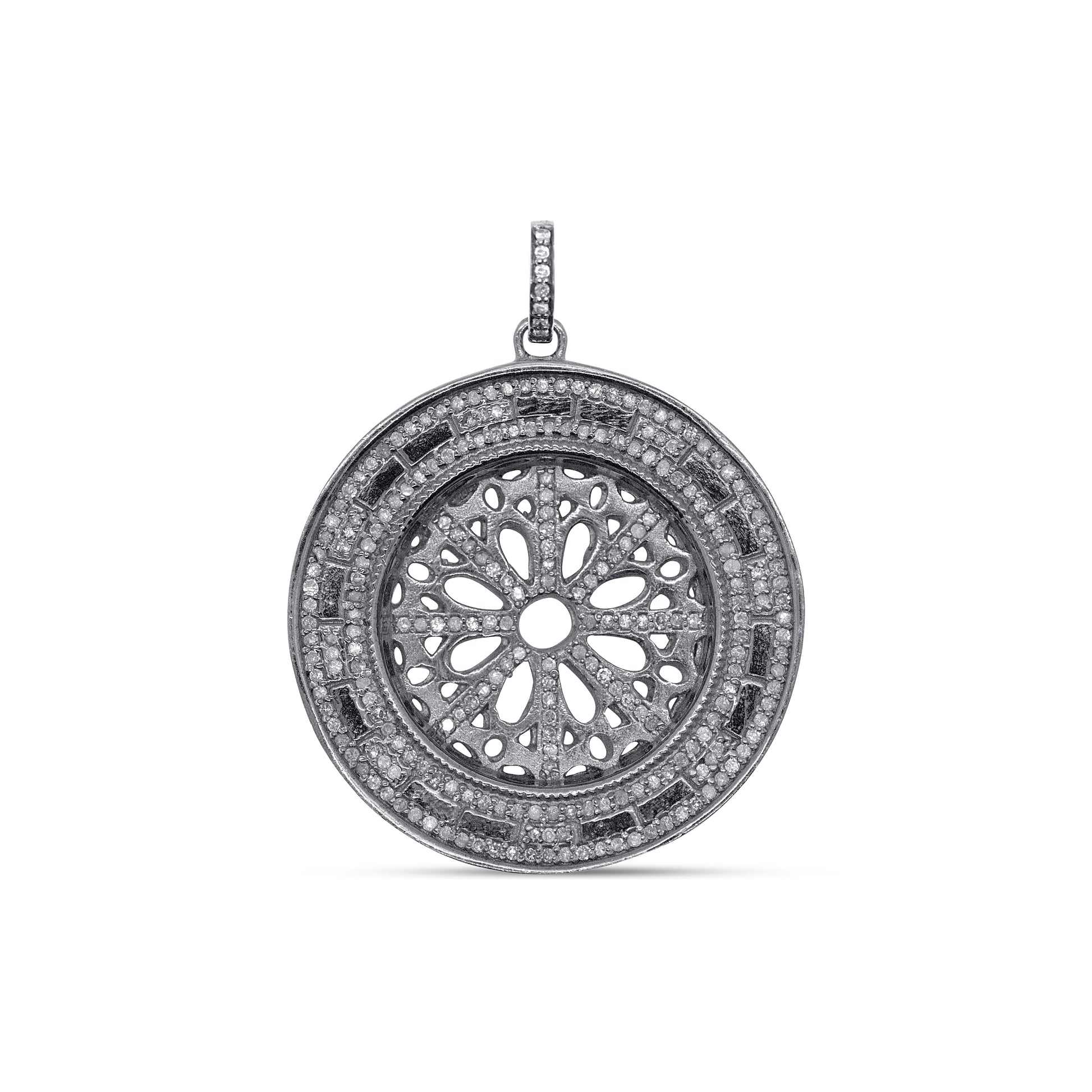 This pendant recalls my visit to the island of Ortigia in Siracusa, Sicily. It is a replica of the 15th century rose window of Chiesa di San Giovanni Battista (Church of St. John the Baptist) in the Piazza del Precursore. The window survived the 1693 earthquake that devastated 70 towns and cities in southern Sicily. This custom historical piece is so elegant and easy to wear with everything.  This is such a luxurious piece with substantial weight. Approximately 38mm. The  diamonds throughout gives it a 3d look with its  variations in thickness.  We believe each jewel tells a story.  Turn heads and inspire your style with this contemporary take on a classic church window.  Effortlessly chic.  Shown here with our essential chain in oxidized sterling silver.