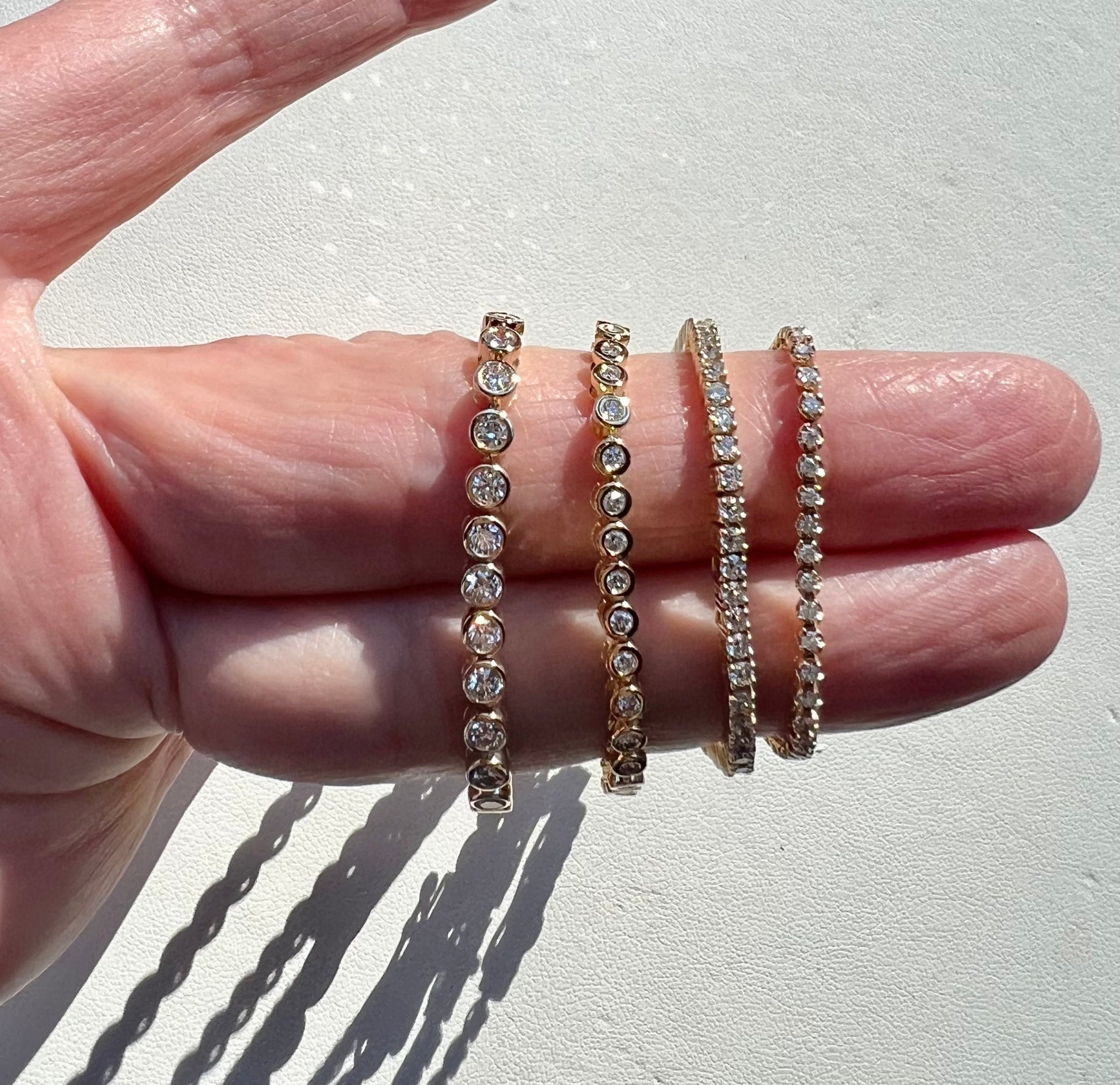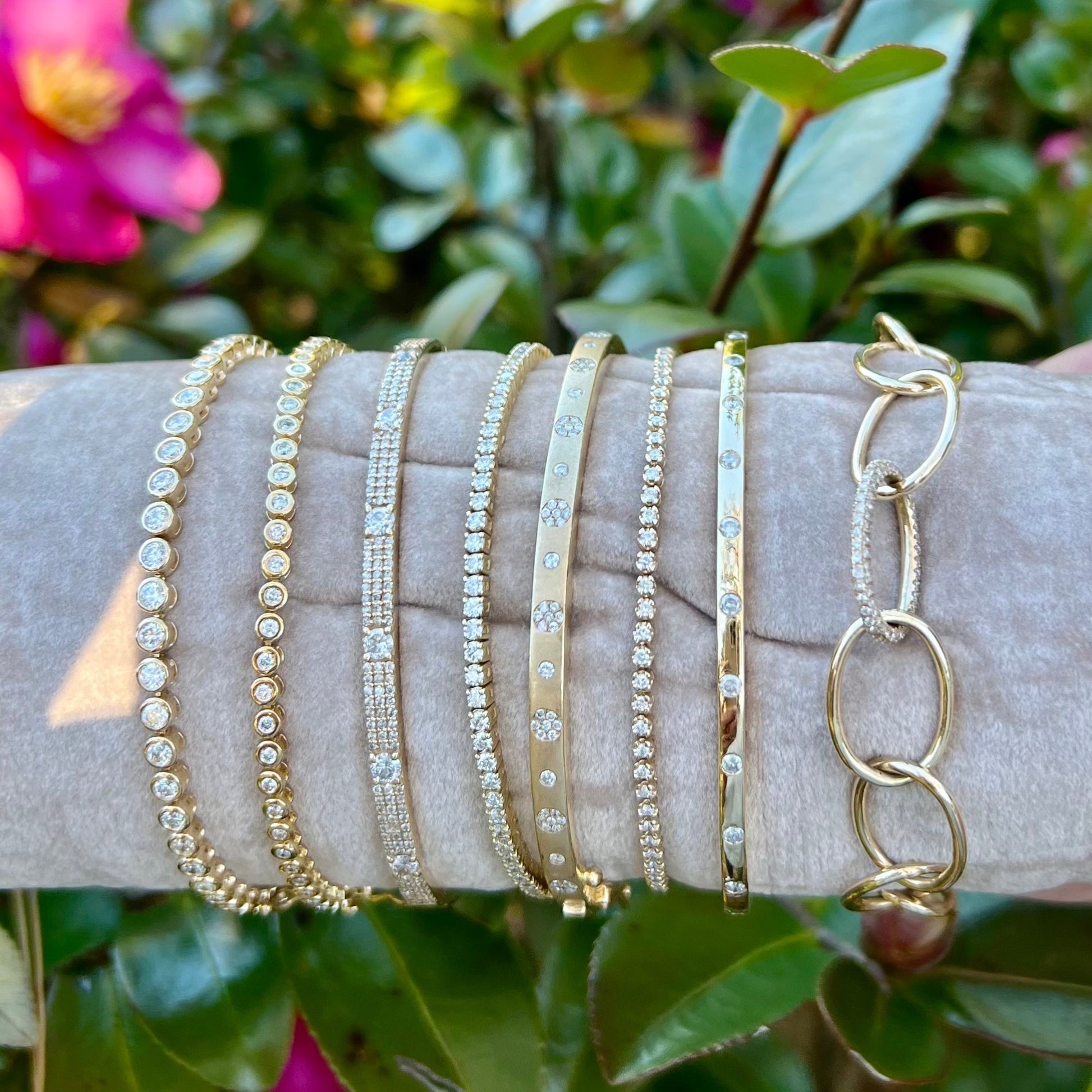 This beautiful diamond bezel Tennis Bracelet is a great addition to your arm stacks. It’s 1.20 carats with natural diamonds in F-G color and S1 clarity.  7 inch length. This is for the small one shown here with the larger size.  Includes double sided safety clasps.  This can be ordered in different lengths and diamond sizes as shown here on a larger sized one. Please contact us for special orders.