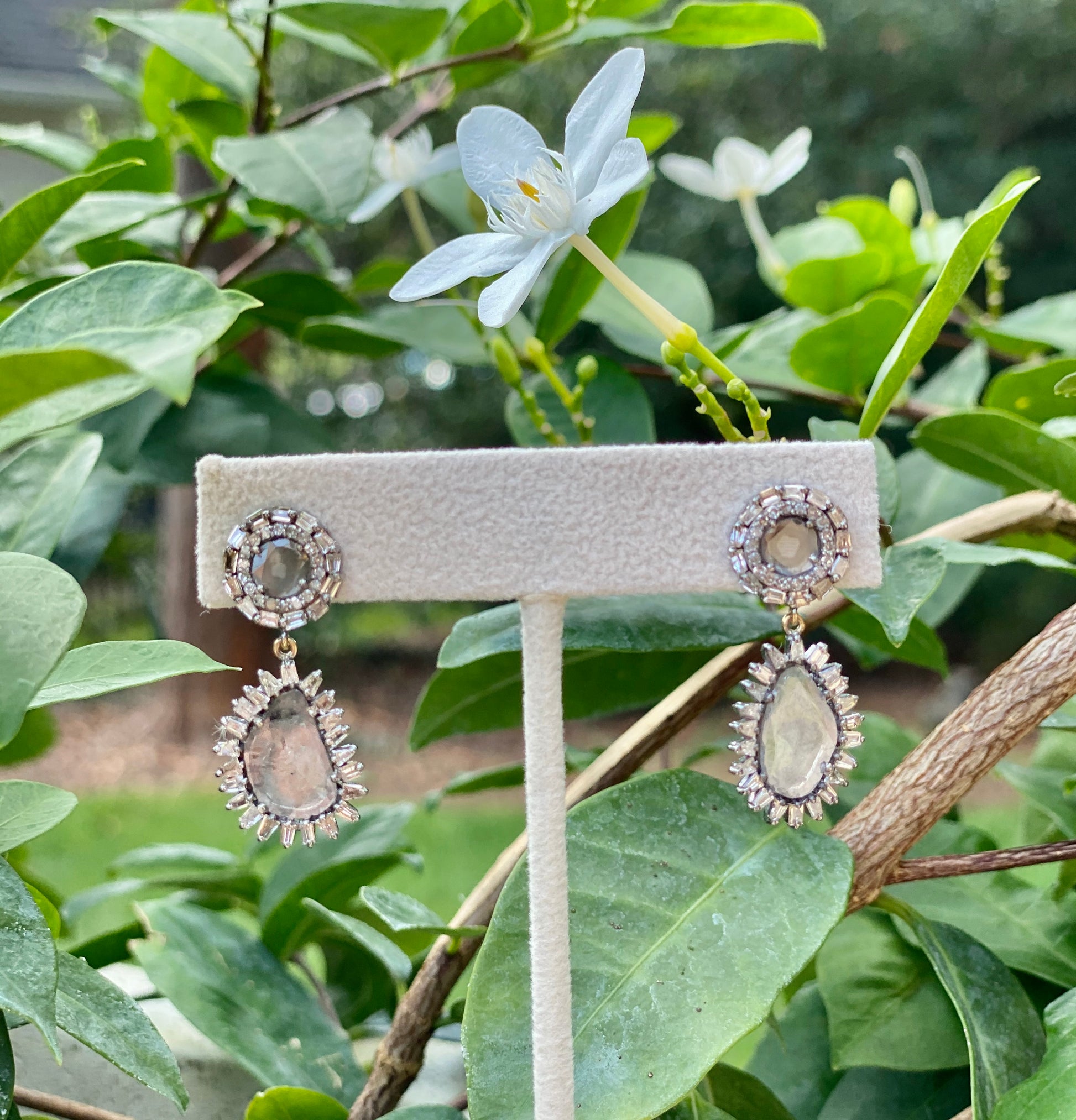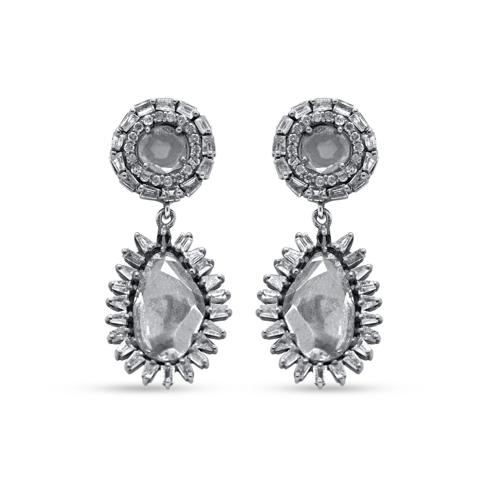 Spectacular sliced diamond dangle earrings with baguettes surrounding in an antique sterling setting. Wear these when you need something special. 15mm by 38 mm ( approximately 1 and 1/3 inches long)