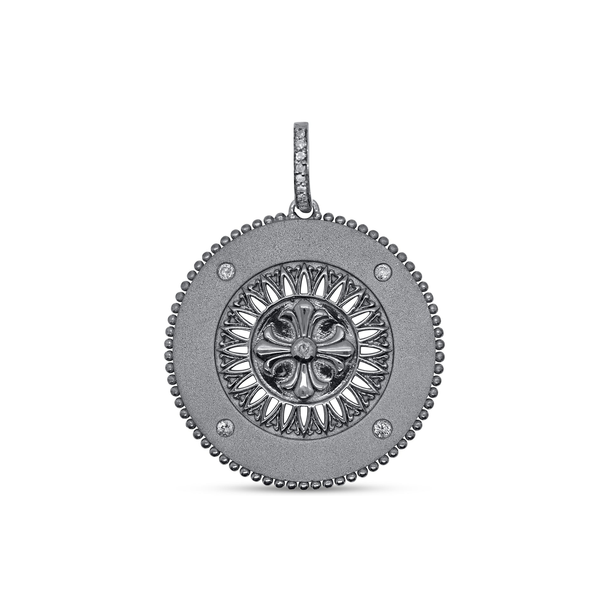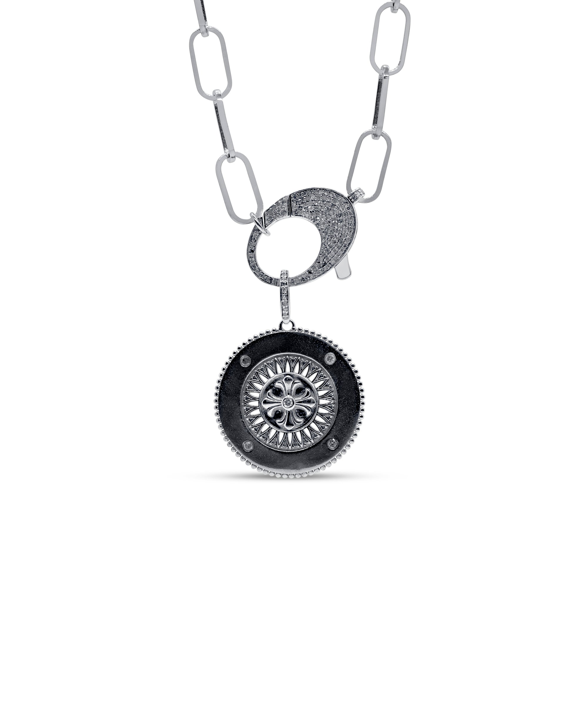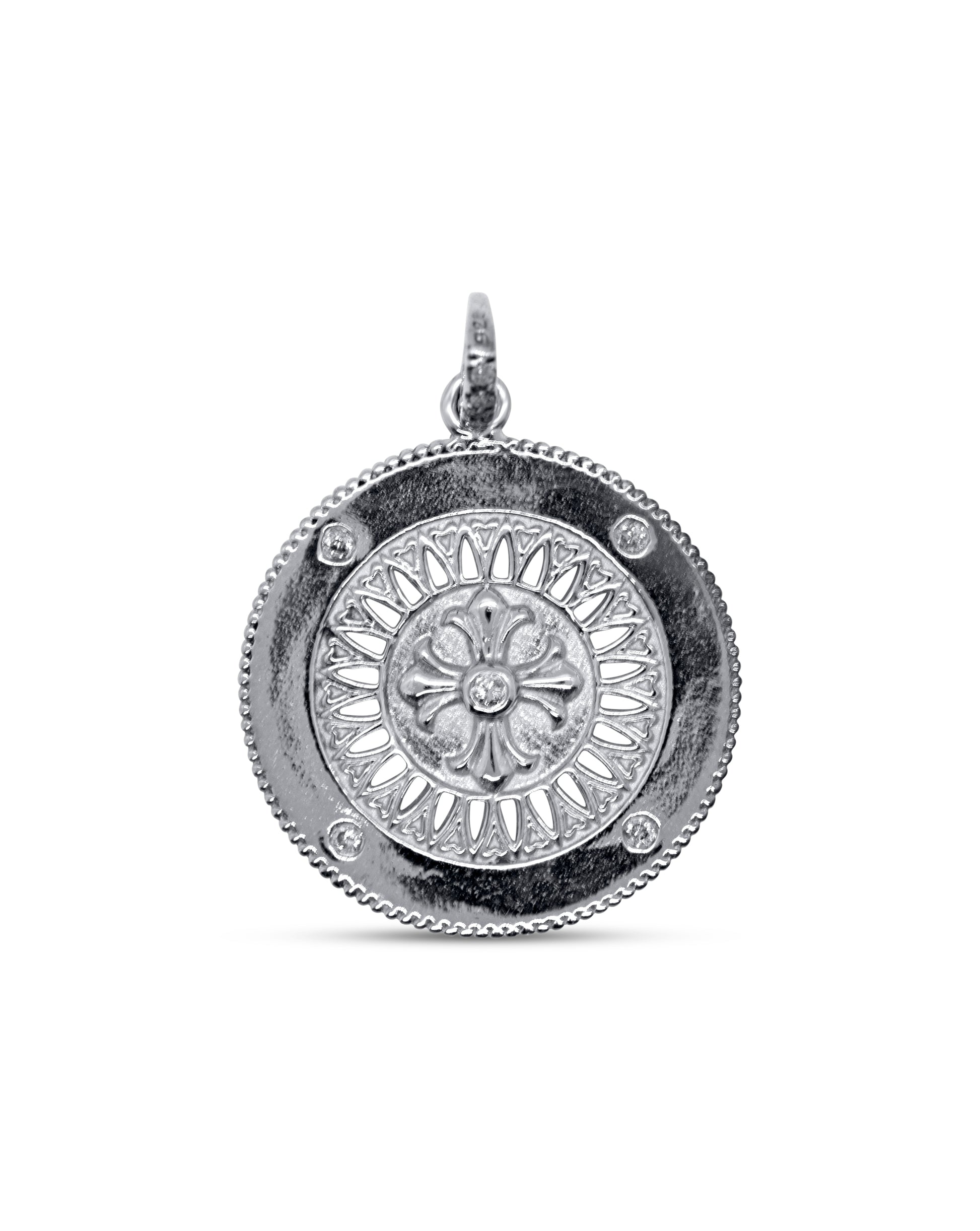 This pendant reimagines the rose window over Fifth Avenue at St Patrick’s Cathedral in Manhattan. Talismans are said to bring good luck. New York City will always hold a special place in my heart. Both my children went there to work after college. One met and married there. The other came back this year reluctantly. We always enjoyed long walks down Madison Avenue, passing both ends of  St. Patrick’s Cathedral along the way. This pendant is a great lightweight piece that goes from day to evening.  The matte gold vermeil and antique matte sterling silver give it a cool modern vibe.  Small is shown here with our oxidized sterling silver everyday chain.  Large is shown with our oxidized sterling silver essential chain.